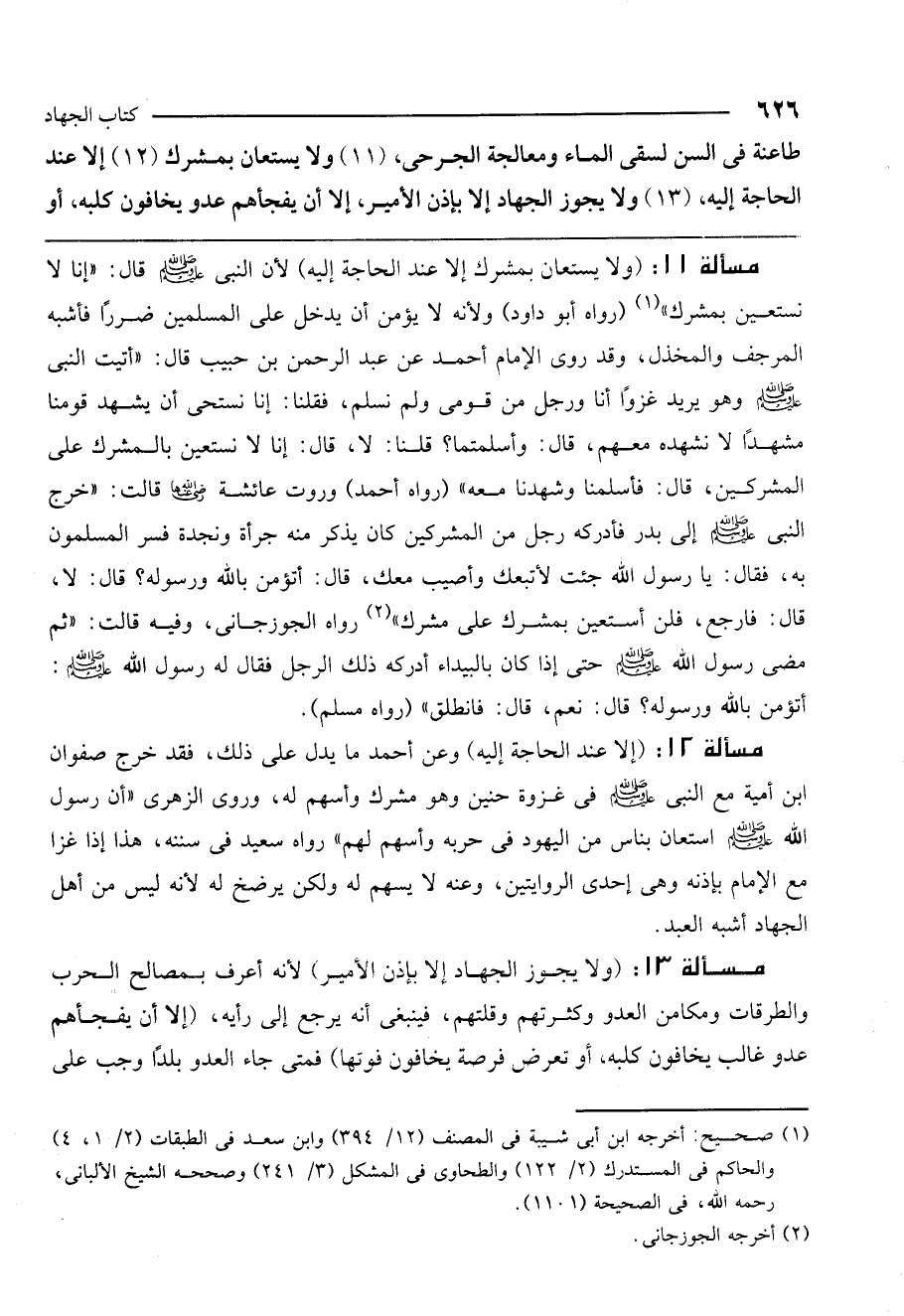 مسألة 12: (إلا عند الحاجة إليه) وعن أحمد ما يدل على ذلك، فقد خرج صفوان بن أمية مع النبي - صَلَّى اللَّهُ عَلَيْهِ وَسَلَّمَ - في غزوة حنين وهو مشرك وأسهم له، وروى الزهري «أن رسول الله - صَلَّى اللَّهُ عَلَيْهِ وَسَلَّمَ - استعان بناس من اليهود في حربه وأسهم لهم» رواه سعيد في سننه، هذا إذا غزا مع الإمام بإذنه وهي إحدى الروايتين، وعنه لا يسهم له ولكن يرضخ له لأنه ليس من أهل الجهاد أشبه العبد.