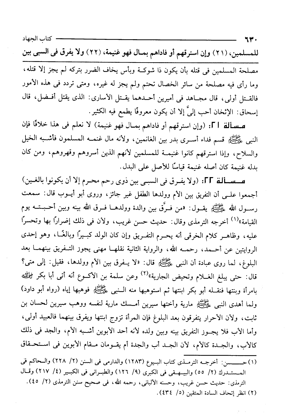 مسألة 22: (ولا يفرق في السبي بين ذوي رحم محرم إلا أن يكونوا بالغين) أجمعوا على أن التفريق بين الأم وولدها الطفل غير جائز، وروى أبو أيوب قال: سمعت رسول الله - صَلَّى اللَّهُ عَلَيْهِ وَسَلَّمَ - يقول: «من فرق بين والدة وولدها فرق الله بينه وبين أحبته يوم القيامة» أخرجه الترمذي وقال: حديث حسن غريب، ولأن في ذلك إضرارا بها وتحسرا عليه، وظاهر كلام الخرقي أنه يحرم التفريق وإن كان الولد كبيرا وبالغا، وهو إحدى الروايتين عن أحمد - رَحِمَهُ اللَّهُ -، والرواية الثانية نقلها مهنى يجوز التفريق بينهما بعد البلوغ، لما روى عبادة أن النبي - صَلَّى اللَّهُ عَلَيْهِ وَسَلَّمَ - قال: «لا يفرق بين الأم وولدها، فقيل: إلى متى؟ قال: حتى يبلغ الغلام وتحيض الجارية» "، وعن سلمة بن الأكوع «أنه أتى أبا بكر - رَضِيَ اللَّهُ عَنْهُ - بامرأة وبنتها فنفله أبو بكر ابنتها ثم استوهبها منه النبي - صَلَّى اللَّهُ عَلَيْهِ وَسَلَّمَ - فوهبها إياه» (رواه أبو داود) ، ولما أهدي النبي - صَلَّى اللَّهُ عَلَيْهِ وَسَلَّمَ - مارية وأختها سيرين أمسك مارية لنفسه ووهب سيرين لحسان بن ثابت، ولأن الأحرار يتفرقون بعد البلوغ فإن المرأة تزوج ابنتها ويفرق بينهما فالعبيد أولى، وأما الأب فلا يجوز التفريق بينه وبين ولده؛ لأنه أحد الأبوين أشبه الأم، والجد في ذلك كالأب، والجدة كالأم؛ لأن الجد أب والجدة أم يقومان مقام الأبوين في استحقاق