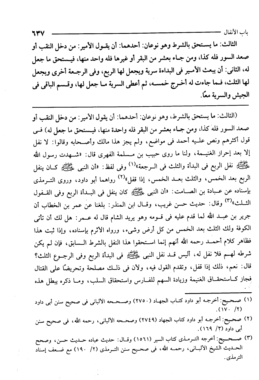 وإذا ثبت هذا فظاهر كلام أحمد - رَحِمَهُ اللَّهُ - أنهم إنما استحقوا هذا النفل بالشرط السابق، فإن لم يكن شرطه لهم فلا نفل له، أليس قد نفل النبي - صَلَّى اللَّهُ عَلَيْهِ وَسَلَّمَ - في البدأة الربع وفي الرجوع الثلث؟ قال: نعم، ذلك إذا قفل، وتقدم القول فيه، ولأن في ذلك مصلحة وتحريضا على القتال فجاز كاستحقاق الغنيمة وزيادة السهم للفارس واستحقاق السلب، وما ذكره يبطل هذه