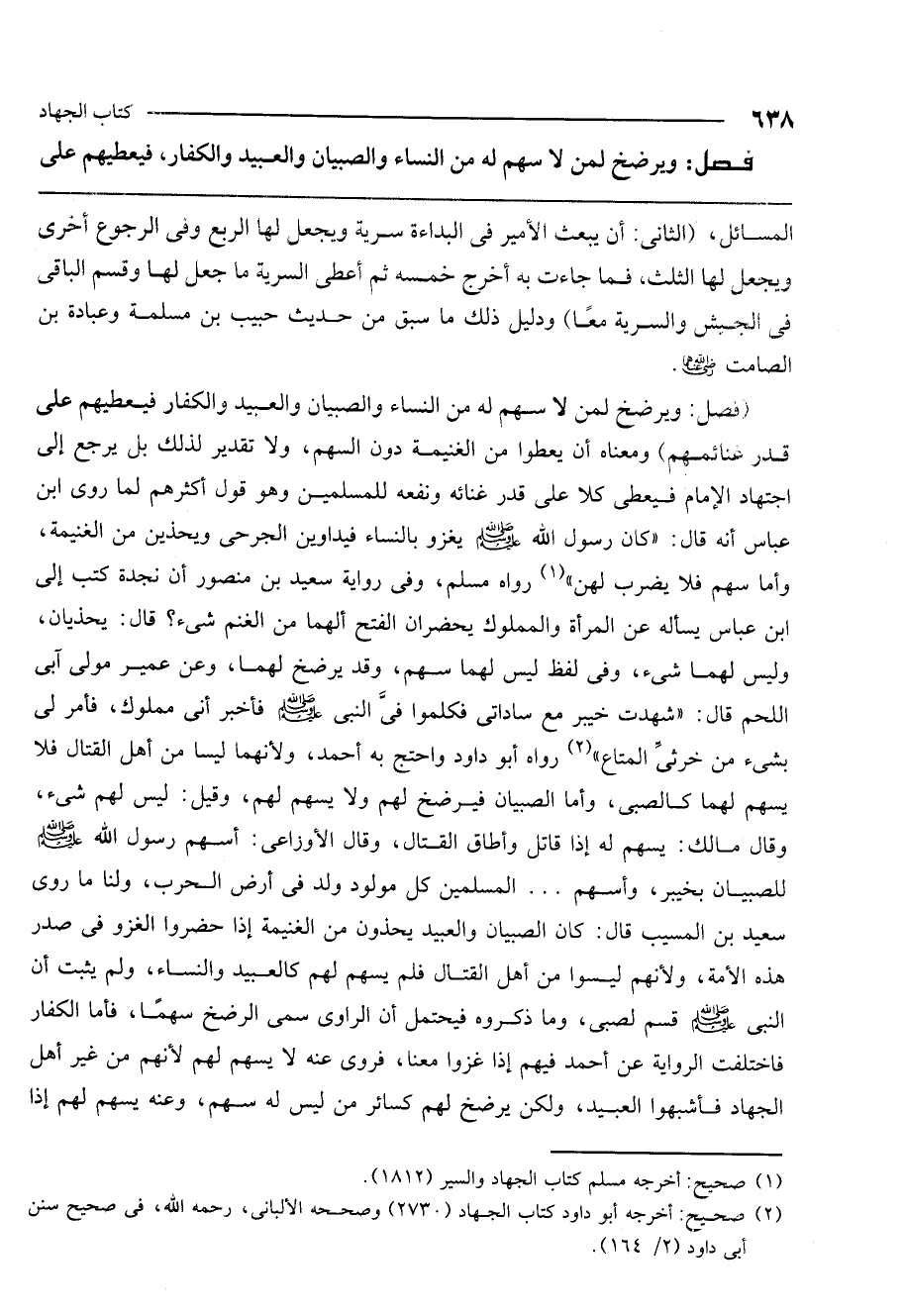 (فصل: ويرضخ لمن لا سهم له من النساء والصبيان والعبيد والكفار فيعطيهم على قدر غنائمهم) ، ومعناه أن يعطوا من الغنيمة دون السهم، ولا تقدير لذلك بل يرجع إلى اجتهاد الإمام فيعطي كلا على قدر غنائه ونفعه للمسلمين، وهو قول أكثرهم لما روى ابن عباس أنه قال: «كان رسول الله - صَلَّى اللَّهُ عَلَيْهِ وَسَلَّمَ - يغزو بالنساء فيداوين الجرحى ويحذين من الغنيمة، وأما سهم فلا يضرب لهن» رواه مسلم، وفي رواية سعيد بن منصور أن نجدة كتب إلى ابن عباس يسأله عن المرأة والمملوك يحضران الفتح ألهما من المغنم شيء؟ قال: يحذيان، وليس لهما شيء، وفي لفظ ليس لهما سهم، وقد يرضخ لهما، وعن عمير مولى أبي اللحم قال: " شهدت خيبر مع ساداتي فكلموا في النبي - صَلَّى اللَّهُ عَلَيْهِ وَسَلَّمَ - فأخبر أني مملوك، فأمر لي بشيء من خرثي المتاع " رواه أبو داود واحتج به أحمد، ولأنهما ليسا من أهل القتال فلا يسهم لهما كالصبي، وأما الصبيان فيرضخ لهم ولا يسهم لهم، وقيل: ليس لهم شيء، وقال مالك: يسهم له إذا قاتل وأطاق القتال، وقال الأوزاعي: أسهم رسول الله - صَلَّى اللَّهُ عَلَيْهِ وَسَلَّمَ - للصبيان بخيبر، وأسهم. . . المسلمين كل مولود ولد في أرض الحرب، ولنا ما روى سعيد بن المسيب قال: كان الصبيان والعبيد يحذون من الغنيمة إذا حضروا الغزو في صدر هذه الأمة، ولأنهم ليسوا من أهل القتال فلم يسهم لهم كالعبيد والنساء، ولم يثبت أن النبي - صَلَّى اللَّهُ عَلَيْهِ وَسَلَّمَ - قسم لصبي، وما ذكروه فيحتمل أن الراوي سمى الرضخ سهما، فأما الكفار فاختلفت الرواية عن أحمد فيهم إذا غزوا معنا، فروي عنه لا يسهم لهم؛ لأنهم من غير أهل الجهاد فأشبهوا العبيد، ولكن يرضخ لهم كسائر من ليس له سهم، وعنه يسهم لهم إذا