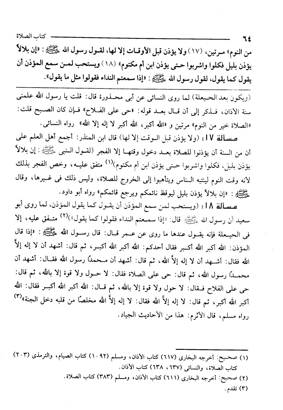 (17) ولا يؤذن قبل الأوقات إلا لها لقول رسول الله - صَلَّى اللَّهُ عَلَيْهِ وَسَلَّمَ -: «إن بلالاً يؤذن بليل، فكلوا واشربوا حتى يؤذن ابن أم مكتوم»