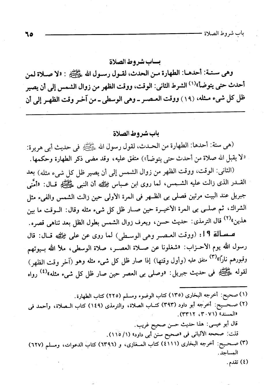 باب شروط الصلاة (هي ستة: أحدها الطهارة من الحدث، لقول رسول الله - صَلَّى اللَّهُ عَلَيْهِ وَسَلَّمَ -: «لا صلاة لمن أحدث حتى يتوضأ» (الشرط الثاني: الوقت، ووقت الظهر من زوال الشمس إلى أن يصير ظل كل شيء مثله)