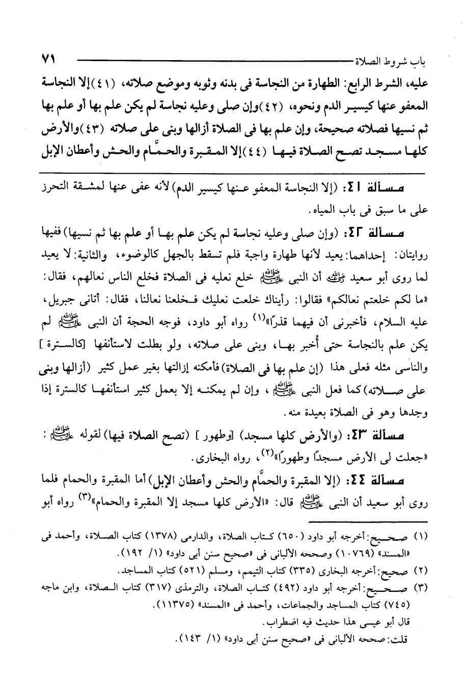مسألة 42: (وإن صلى وعليه نجاسة لم يكن علم بها أو علم بها ثم نسيها) ففيها روايتان: إحداهما: يعيد لأنها طهارة واجبة فلم تسقط بالجهل كالوضوء، والثانية: لا يعيد لما روى أبو سعيد - رَضِيَ اللَّهُ عَنْهُ - «أن النبي - صَلَّى اللَّهُ عَلَيْهِ وَسَلَّمَ - خلع نعليه في الصلاة فخلع الناس نعالهم، فقال: "ما لكم خلعتم نعالكم" فقالوا: رأيناك خلعت نعليك فخلعنا نعالنا، فقال: "أتاني جبريل - عَلَيْهِ السَّلَامُ - فأخبرني أن فيهما قذراً» رواه أبو داود، فوجه الحجة أن النبي - صَلَّى اللَّهُ عَلَيْهِ وَسَلَّمَ - لم يكن علم بالنجاسة حتى أخبر بها، وبنى على صلاته، ولو بطلت لاستأنفها [كالسترة] ، والناسي مثله فعلى هذا (إن علم بها في الصلاة) فأمكنه إزالتها بغير عمل كثير (أزالها وبنى على صلاته) كما فعل النبي - صَلَّى اللَّهُ عَلَيْهِ وَسَلَّمَ -، وإن لم يمكنه إلا بعمل كثير استأنفها كالسترة إذا وجدها وهو في الصلاة بعيدة منه.