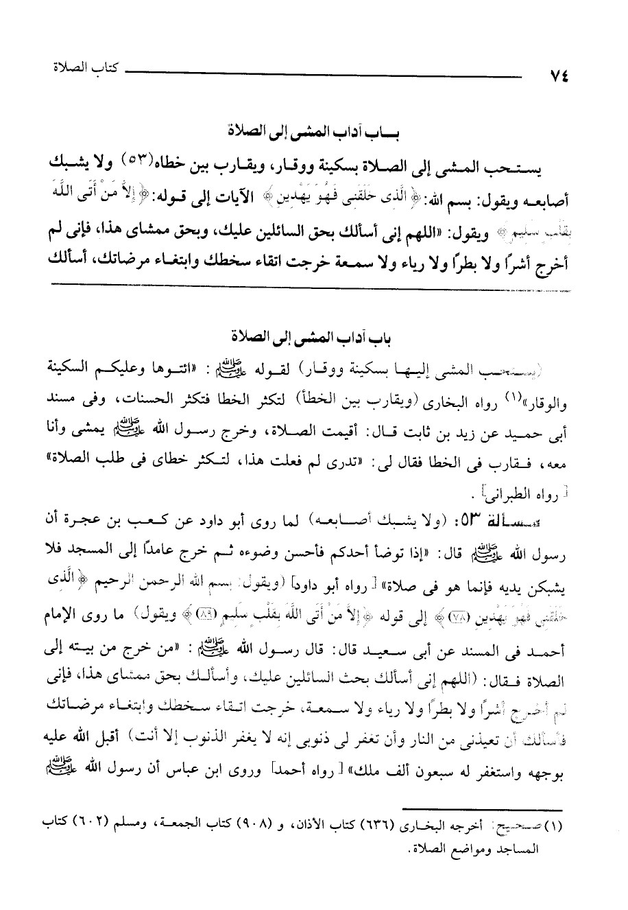 مسألة 53: (ولا يشبك أصابعه) لما روى أبو داود عن كعب بن عجرة أن رسول الله - صَلَّى اللَّهُ عَلَيْهِ وَسَلَّمَ - قال: «إذا توضأ أحدكم فأحسن وضوءه ثم خرج عامداً إلى المسجد فلا يشبكن يديه فإنما هو في صلاة» [رواه أبو داود] (ويقول: بِسْمِ اللَّهِ الرَّحْمَنِ الرَّحِيمِ {الَّذِي خَلَقَنِي فَهُوَ يَهْدِينِ} [الشعراء: 78] إلى قوله {إِلا مَنْ أَتَى اللَّهَ بِقَلْبٍ سَلِيمٍ} [الشعراء: 89] ويقول) ما روى الإمام أحمد في المسند عن أبي سعيد قال: قال رسول الله - صَلَّى اللَّهُ عَلَيْهِ وَسَلَّمَ -: «من خرج من بيته إلى الصلاة فقال: (اللهم إني أسألك بحق السائلين عليك، وأسألك بحق ممشاي هذا، فإني لم أخرج أشراً ولا بطراً ولا رياء ولا سمعة، خرجت اتقاء سخطك وابتغاء مرضاتك فأسألك أن تعيذني من النار وأن تغفر لي ذنوبي إنه لا يغفر الذنوب إلا أنت) أقبل الله عليه بوجهه واستغفر له سبعون ألف ملك» [رواه أحمد] وروى ابن عباس «أن رسول الله - صَلَّى اللَّهُ عَلَيْهِ وَسَلَّمَ -