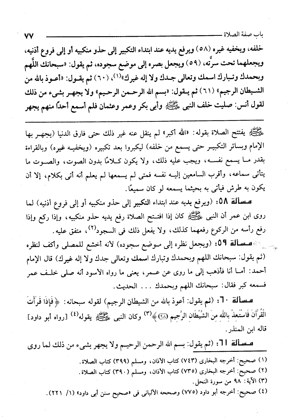 مسألة 60: (ثم يقول: أعوذ بالله من الشيطان الرجيم) لقوله سبحانه: {فَإِذَا قَرَأْتَ الْقُرْآنَ فَاسْتَعِذْ بِاللَّهِ مِنَ الشَّيْطَانِ الرَّجِيمِ} [النحل: 98] وكان النبي - صَلَّى اللَّهُ عَلَيْهِ وَسَلَّمَ - يقوله [رواه أبو داود] قاله ابن المنذر.