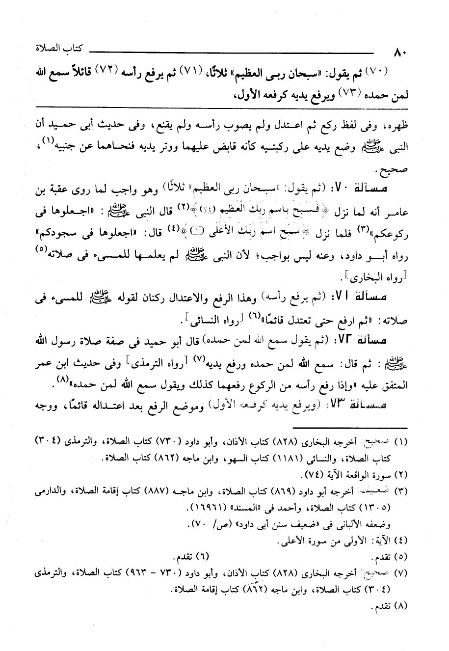 مسألة 72: (ثم يقول سمع الله لمن حمده) قال أبو حميد في صفة صلاة رسول الله - صَلَّى اللَّهُ عَلَيْهِ وَسَلَّمَ -: «ثم قال سمع الله لمن حمده ورفع يديه» [رواه الترمذي] وفي حديث ابن عمر المتفق عليه «وإذا رفع رأسه من الركوع رفعهما كذلك ويقول سمع الله لمن حمده» .