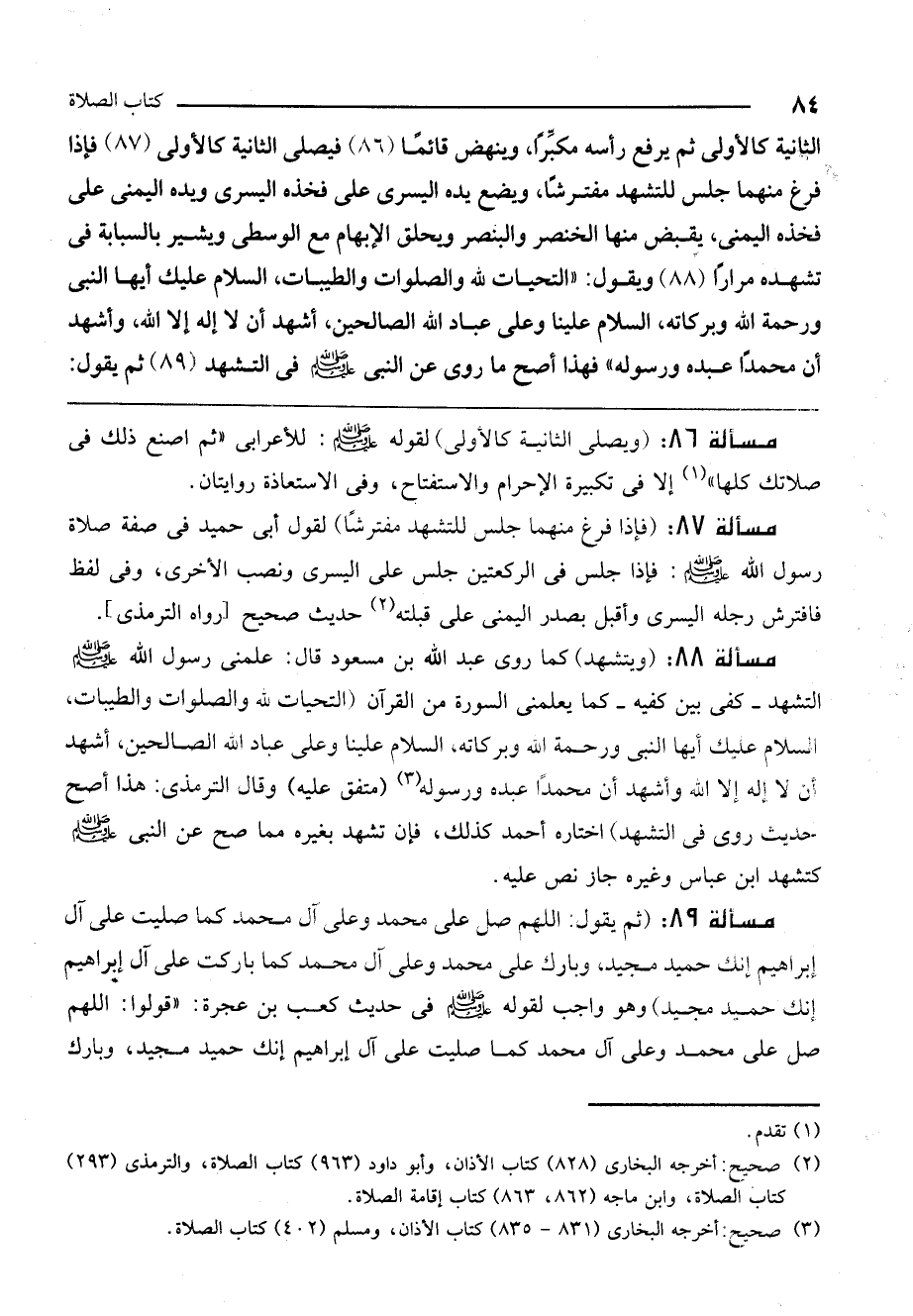 مسألة 87: (فإذا فرغ منهما جلس للتشهد مفترشاً) ، لقول أبي حميد في صفة صلاة رسول الله - صَلَّى اللَّهُ عَلَيْهِ وَسَلَّمَ -: «فإذا جلس في الركعتين جلس على اليسرى ونصب الأخرى، وفي لفظ فافترش رجله اليسرى وأقبل بصدر اليمنى على قبلته» ، حديث صحيح [رواه الترمذي] .