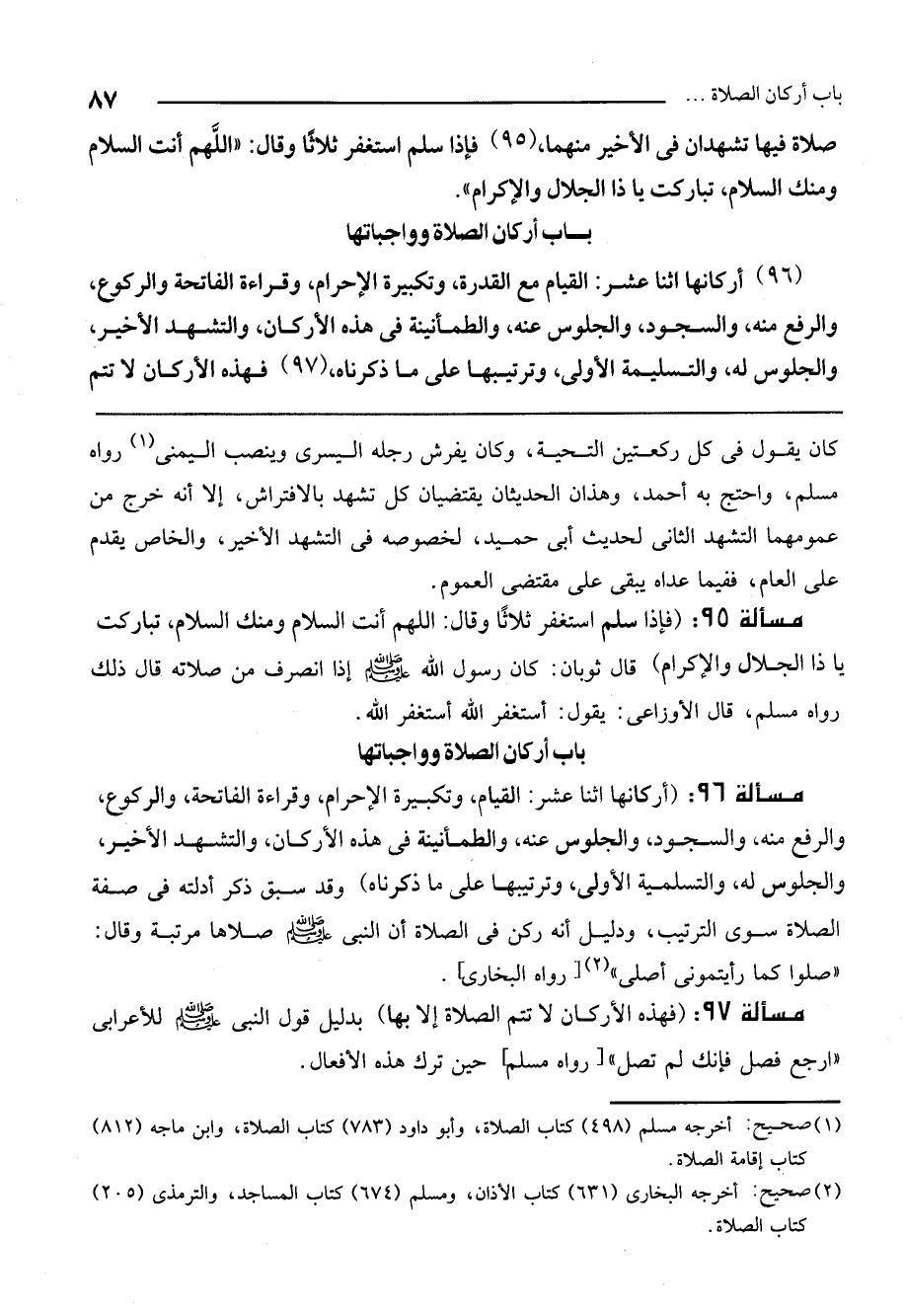 مسألة 97: (فهذه الأركان لا تتم الصلاة إلا بها) بدليل قول النبي - صَلَّى اللَّهُ عَلَيْهِ وَسَلَّمَ - للأعرابي: «ارجع فصل فإنك لم تصل» [رواه مسلم] حين ترك هذه الأفعال.