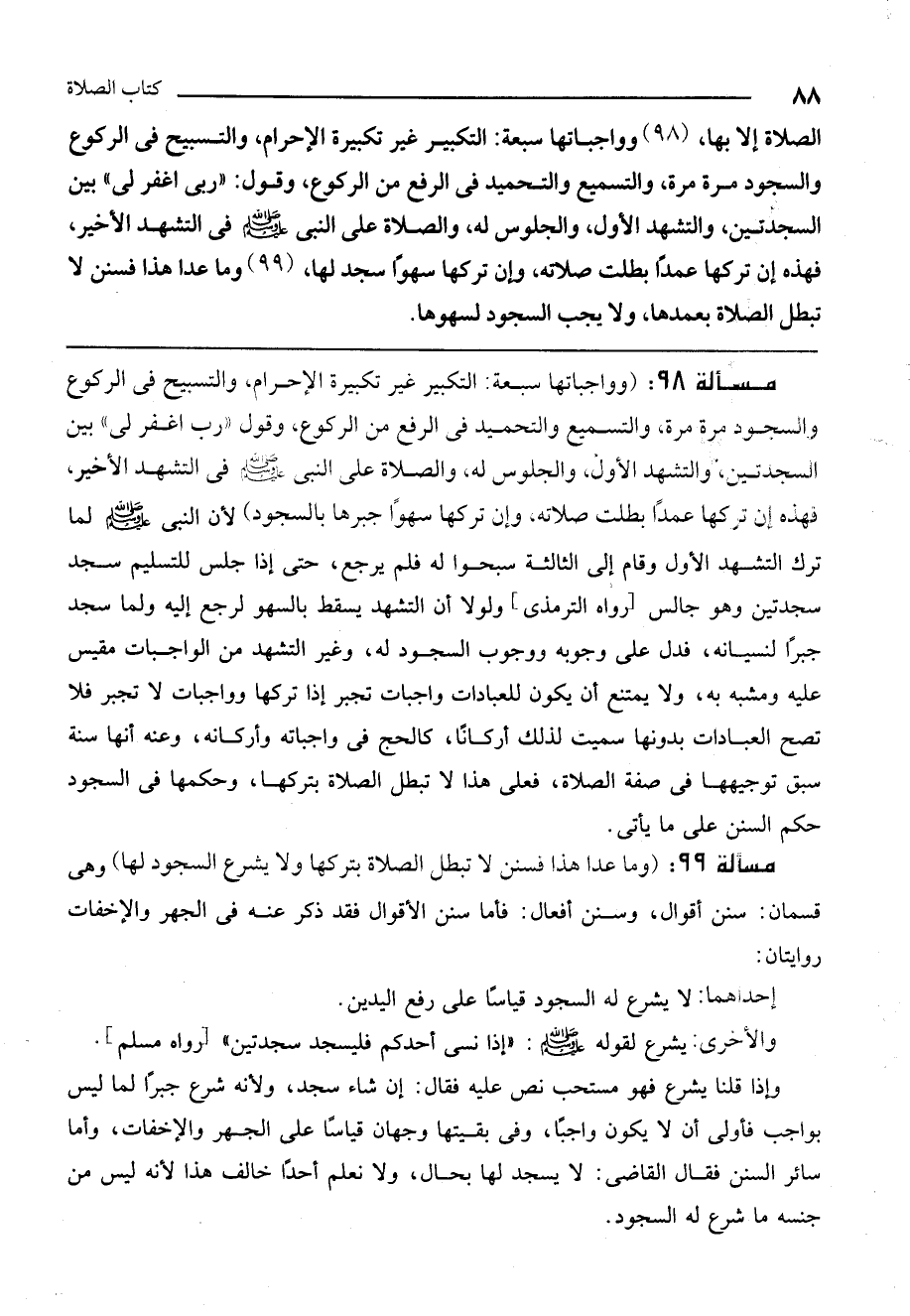 (99) وما عدا هذا فسنن لا تبطل الصلاة بعمدها. ولا يجب السجود لسهوها