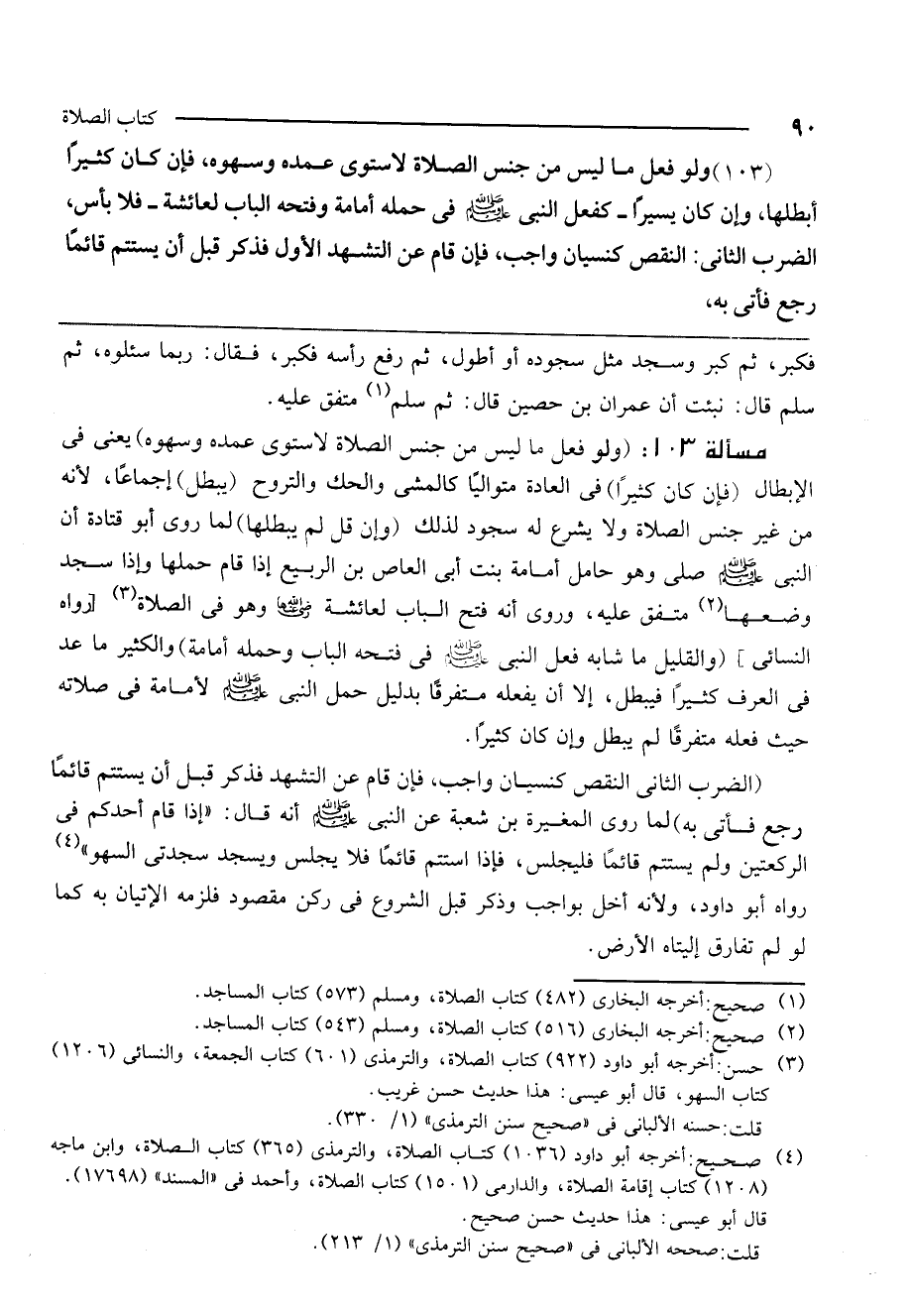 (103) ولو فعل ما ليس من جنس الصلاة لاستوى عمده وسهوه، فإن كان كثيراً أبطلها، وإن كان يسيراً - «كفعل النبي - صَلَّى اللَّهُ عَلَيْهِ وَسَلَّمَ - في حمله أمامة وفتحه الباب لعائشة» - فلا بأس، الضرب الثاني: النقص كنسيان واجب، فإن قام عن التشهد الأول فذكر قبل أن يستتم قائماً رجع فأتى به