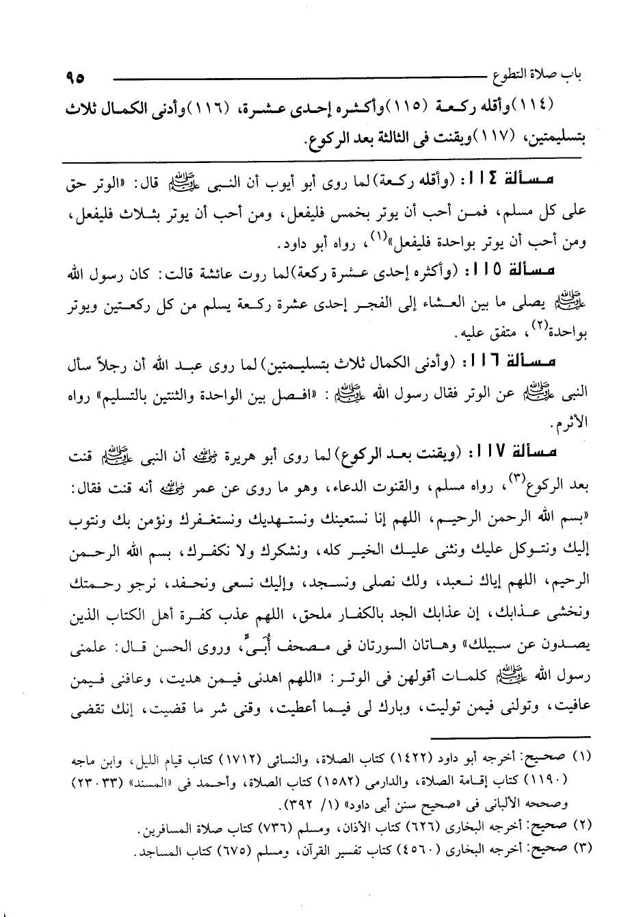 مسألة 116: (وأدنى الكمال ثلاث بتسليمتين) لما روى عبد الله «أن رجلاً سأل النبي - صَلَّى اللَّهُ عَلَيْهِ وَسَلَّمَ - عن الوتر فقال رسول الله - صَلَّى اللَّهُ عَلَيْهِ وَسَلَّمَ -: "افصل بين الواحدة والثنتين بالتسليم» رواه الأثرم.