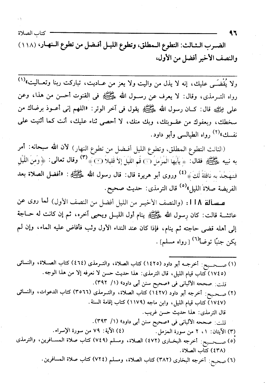مسألة 118: (والنصف الأخير من الليل أفضل من النصف الأول) لما روي عن عائشة قالت: «كان رسول الله - صَلَّى اللَّهُ عَلَيْهِ وَسَلَّمَ - ينام أول الليل ويحيي آخره، ثم إن كانت له حاجة إلى أهله قضى حاجته ثم ينام، فإذا كان عند النداء الأول وثب فأفاض عليه الماء، وإن لم يكن جنباً توضأ» [رواه مسلم] .