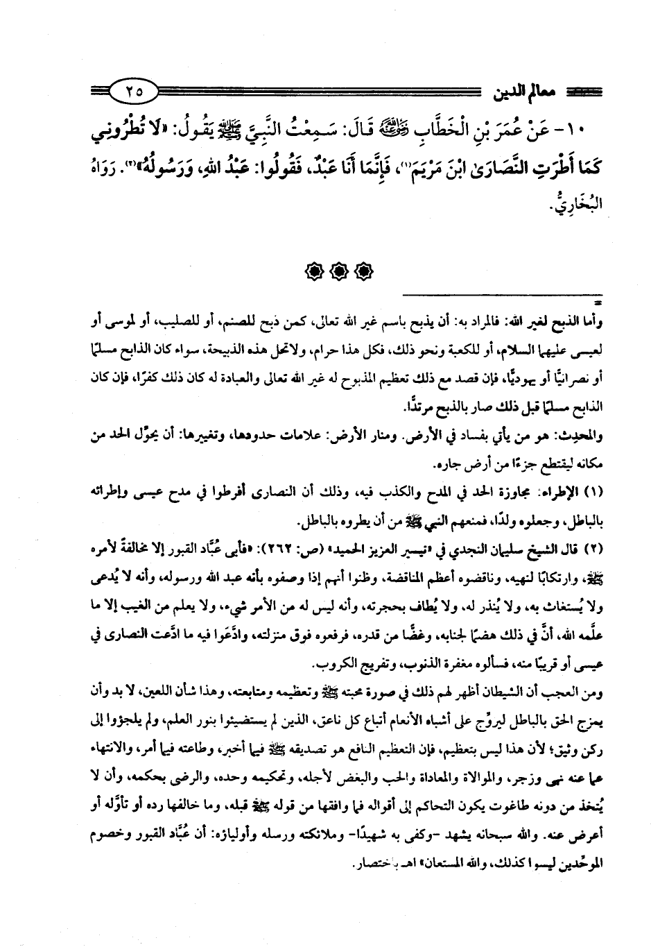 10 - عَنْ عُمَرَ بْنِ الْخَطَّابِ - رضي الله عنه - قَالَ: سَمِعْتُ النَّبِيَّ - صلى الله عليه وسلم - يَقُولُ: «لَا تُطْرُونِي كَمَا أَطْرَتِ النَّصَارَى ابْنَ مَرْيَمَ (¬1)، فَإِنَّمَا أَنَا عَبْدٌ، فَقُولُوا: عَبْدُ اللَّهِ، وَرَسُولُهُ» (¬2). رَوَاهُ البُخَارِيُّ.