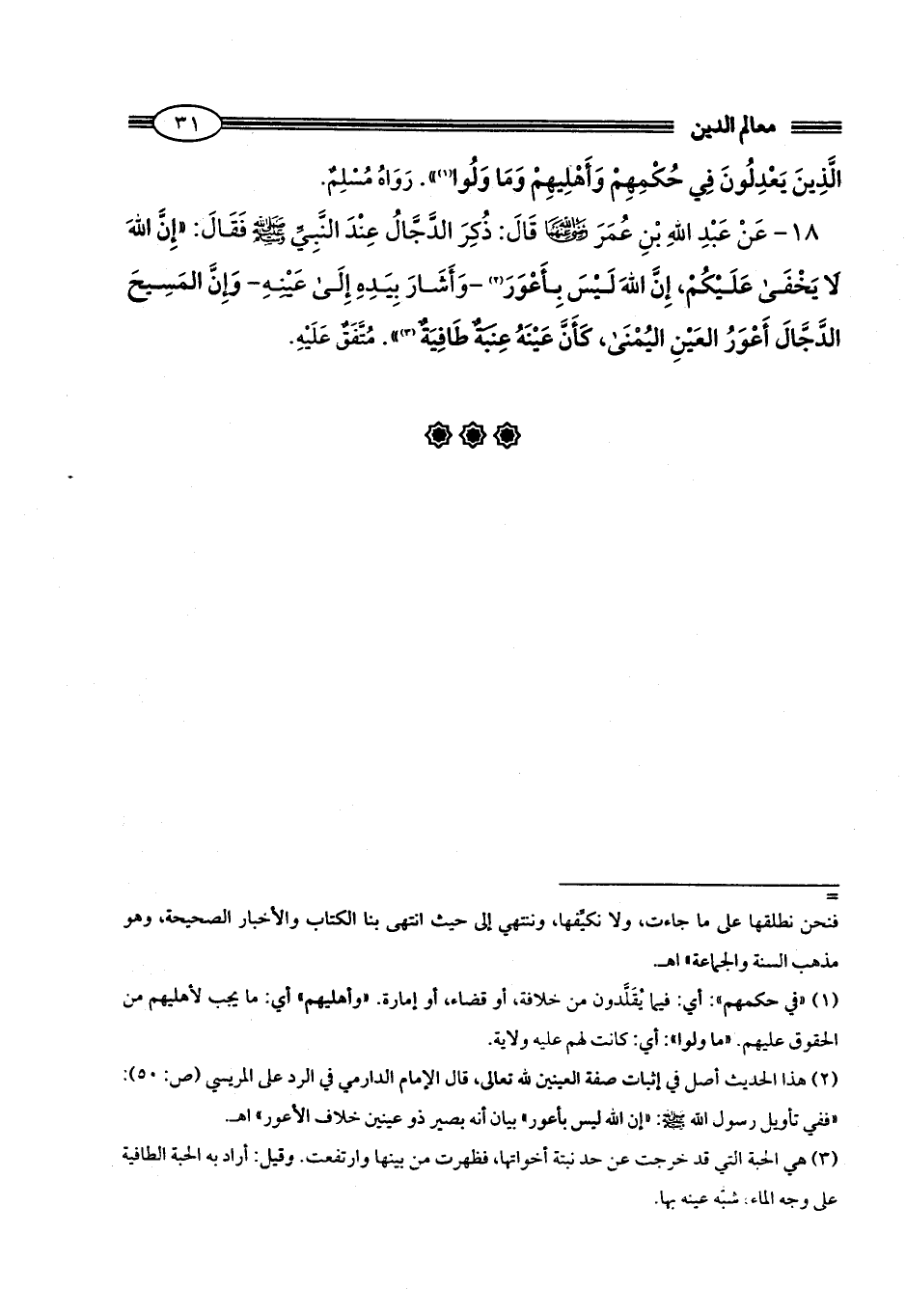 (¬2) هذا الحديث أصل في إثبات صفة العينين لله تعالى، قال الإمام الدارمي في الرد على المريسي (ص: 50): «ففي تأويل رسول الله - صلى الله عليه وسلم -: «إن الله ليس بأعور» بيان أنه بصير ذو عينين خلاف الأعور» اهـ.