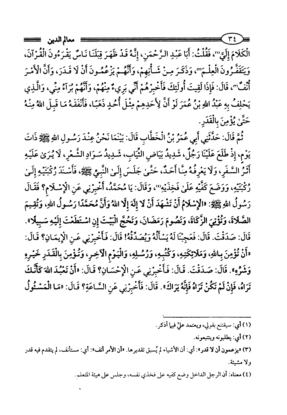 ثُمَّ قَالَ: حَدَّثَنِي أَبِي عُمَرُ بْنُ الْخَطَّابِ قَالَ: بَيْنَمَا نَحْنُ عِنْدَ رَسُولِ اللهِ - صلى الله عليه وسلم - ذَاتَ يَوْمٍ، إِذْ طَلَعَ عَلَيْنَا رَجُلٌ، شَدِيدُ بَيَاضِ الثِّيَابِ، شَدِيدُ سَوَادِ الشَّعْرِ، لَا يُرَى عَلَيْهِ أَثَرُ السَّفَرِ، وَلَا يَعْرِفُهُ مِنَّا أَحَدٌ، حَتَّى جَلَسَ إِلَى النَّبِيِّ - صلى الله عليه وسلم -، فَأَسْنَدَ رُكْبَتَيْهِ إِلَى رُكْبَتَيْهِ، وَوَضَعَ كَفَّيْهِ عَلَى فَخِذَيْهِ (¬4)، وَقَالَ: يَا مُحَمَّدُ، أَخْبِرْنِي عَنِ الْإِسْلَامِ؟ فَقَالَ رَسُولُ اللهِ - صلى الله عليه وسلم -: «الْإِسْلَامُ أَنْ تَشْهَدَ أَنْ لَا إِلَهَ إِلَّا اللهُ وَأَنَّ مُحَمَّدًا رَسُولُ اللهِ، وَتُقِيمَ الصَّلَاةَ، وَتُؤْتِيَ الزَّكَاةَ، وَتَصُومَ رَمَضَانَ، وَتَحُجَّ الْبَيْتَ إِنِ اسْتَطَعْتَ إِلَيْهِ سَبِيلًا». قَالَ: صَدَقْتَ. قَالَ: فَعَجِبْنَا لَهُ يَسْأَلُهُ وَيُصَدِّقُهُ! قَالَ: فَأَخْبِرْنِي عَنِ الْإِيمَانِ؟ قَالَ: «أَنْ تُؤْمِنَ بِاللهِ، وَمَلَائِكَتِهِ، وَكُتُبِهِ، وَرُسُلِهِ، وَالْيَوْمِ الْآخِرِ، وَتُؤْمِنَ بِالْقَدَرِ خَيْرِهِ وَشَرِّهِ». قَالَ: صَدَقْتَ. قَالَ: فَأَخْبِرْنِي عَنِ الْإِحْسَانِ؟ قَالَ: «أَنْ تَعْبُدَ اللهَ كَأَنَّكَ تَرَاهُ، فَإِنْ لَمْ تَكُنْ تَرَاهُ فَإِنَّهُ يَرَاكَ». قَالَ: فَأَخْبِرْنِي عَنِ السَّاعَةِ؟ قَالَ: «مَا الْمَسْئُولُ