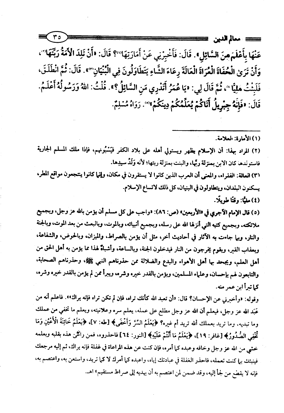 عَنْهَا بِأَعْلَمَ مِنَ السَّائِلِ». قَالَ: فَأَخْبِرْنِي عَنْ أَمَارَتِهَا (¬1)؟ قَالَ: «أَنْ تَلِدَ الْأَمَةُ رَبَّتَهَا (¬2)، وَأَنْ تَرَى الْحُفَاةَ الْعُرَاةَ الْعَالَةَ رِعَاءَ الشَّاءِ يَتَطَاوَلُونَ فِي الْبُنْيَانِ (¬3)». قَالَ: ثُمَّ انْطَلَقَ، فَلَبِثْتُ مَلِيًّا (¬4)، ثُمَّ قَالَ لِي: «يَا عُمَرُ أَتَدْرِي مَنِ السَّائِلُ؟». قُلْتُ: اللهُ وَرَسُولُهُ أَعْلَمُ. قَالَ: «فَإِنَّهُ جِبْرِيلُ أَتَاكُمْ يُعَلِّمُكُمْ دِينَكُمْ» (¬5). رَوَاهُ مُسْلِمٌ.