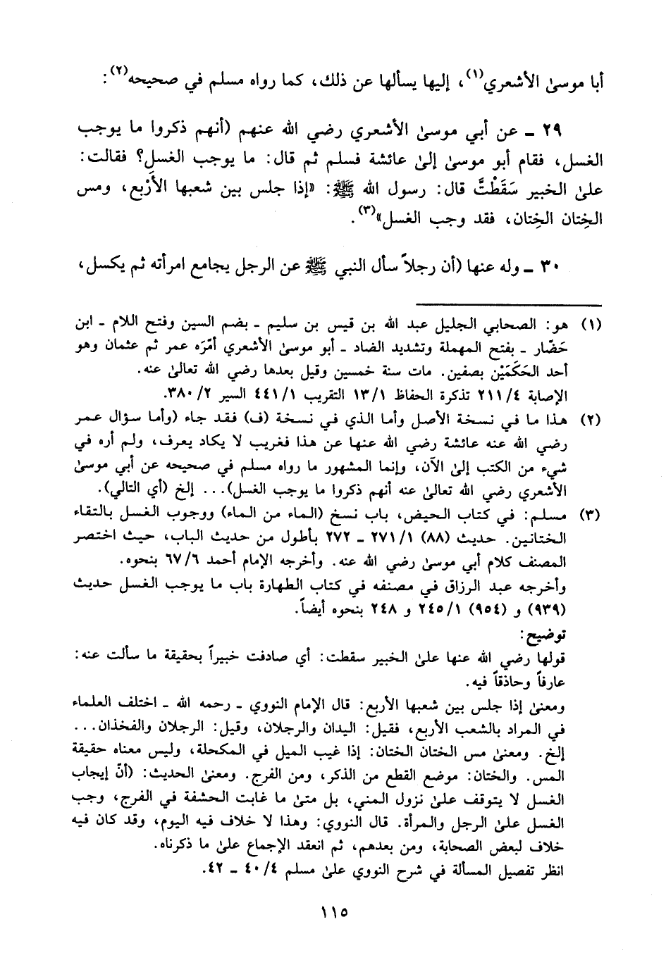 29- عن أبي موسى الأشعري, رضي الله عنه "أنهم ذكروا ما يوجب الغسل، فقام أبو موسى إلى عائشة فسلم ثم قال: ما يوجب الغسل؟ فقالت: على الخبير سقطت؛ قال رسول الله, صلى الله عليه وسلم: "إذا جلس بين شعبها الأربع ومس الختان الختان، فقد وجب الغسل" "3.
