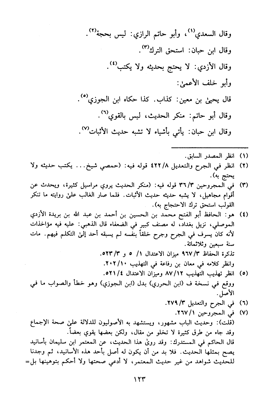 4 هو: الحافظ أبو الفتح محمد بن الحسين بن أحمد بن عبد الله بن بريدة, الأزدي الموصلي، نزيل بغداد، له مصنف كبير في الضعفاء قال الذهبي عليه: فيه مؤاخذات؛ لأنه كان يسرف في الجرح, وجرح خلقا بنفسه لم يسبقه أحد إلى التكلم فيهم. مات سنة سبعين وثلاثمائة.