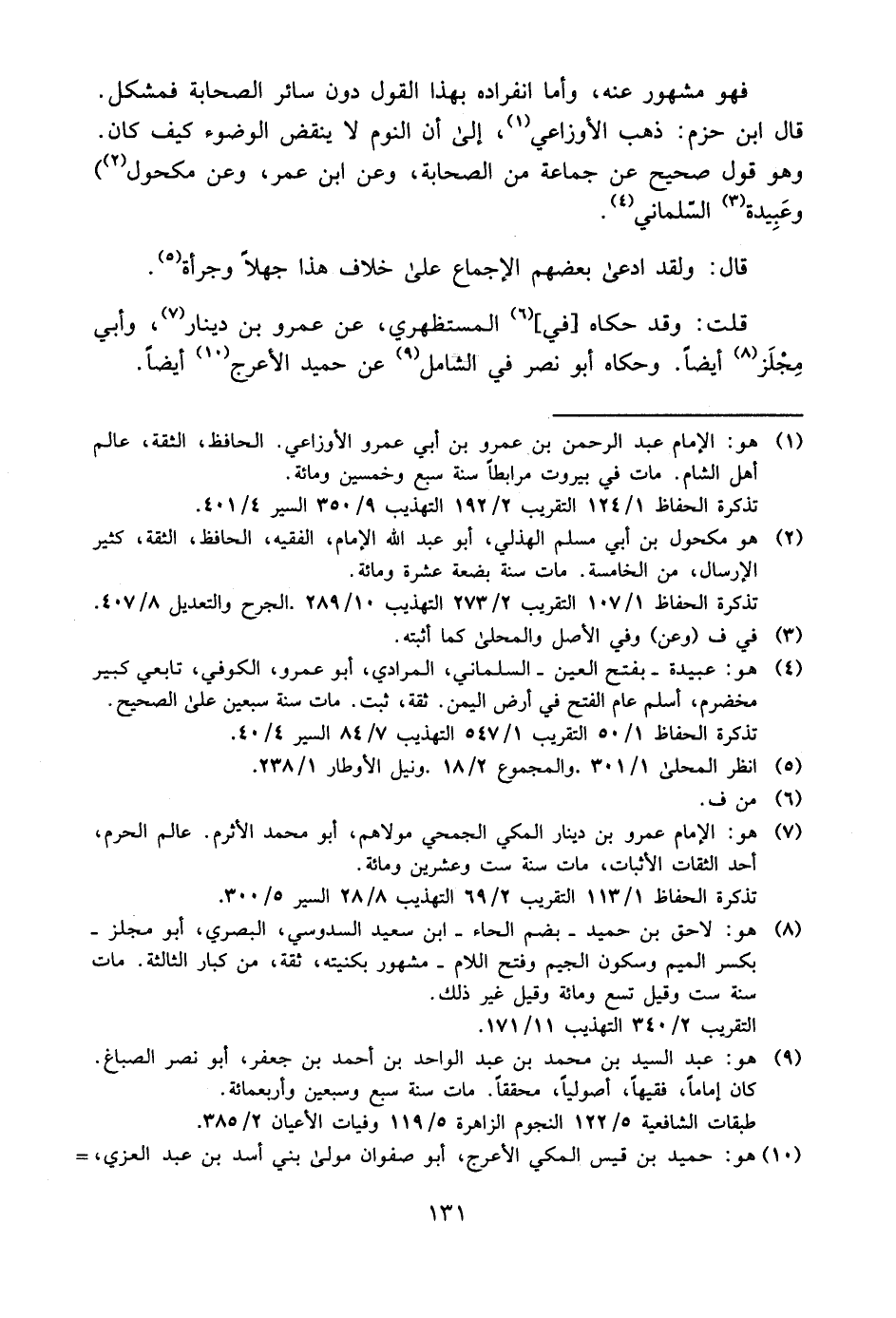 قال ابن حزم: ذهب الأوزاعي1 إلى أن النوم لا ينقض الوضوء كيف كان. وهو قول صحيح عن جماعة من الصحابة، وعن ابن عمر، وعن مكحول2, وعبيدة3 السلماني4.