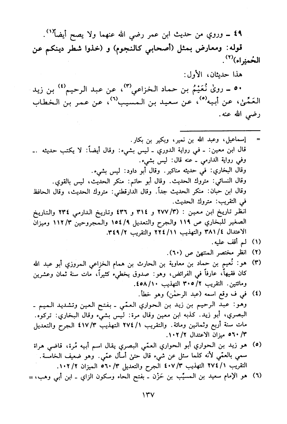 50- روى نعيم بن حماد الخزاعي3، عن عبد الرحيم4 بن زيد العمي، عن أبيه5، عن سعيد بن المسيب6, عن عمر بن الخطاب -رضي الله عنه-