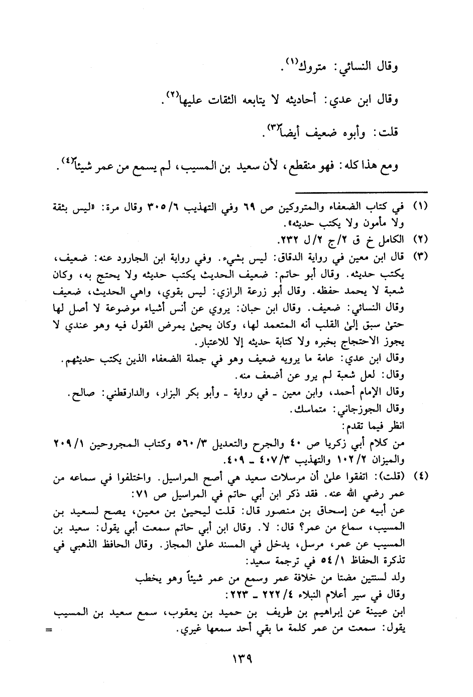 4 "قلت": اتفقوا على أن مرسلات سعيد هي أصح المراسيل, واختلفوا في سماعه من عمر رضي الله عنه. فقد ذكر ابن أبي حاتم في المراسيل ص71: