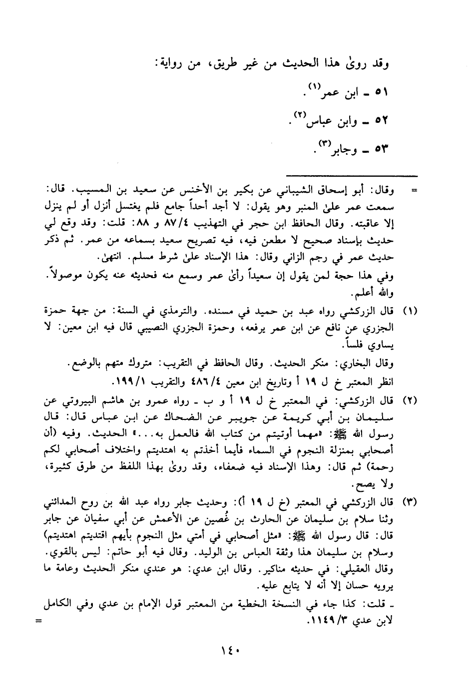 3 قال الزركشي في المعتبر "خ ل19 أ": وحديث جابر رواه عبد الله بن روح المدائني, وثنا سلام بن سليمان عن الحارث بن غصين عن الأعمش عن أبي سفيان عن جابر قال: قال رسول الله, صلى الله عليه وسلم: "مثل أصحابي في أمتي مثل النجوم, بأيهم اقتديتم اهتديتم" وسلام بن سليمان هذا وثقه العباس بن الوليد. وقال فيه أبو حاتم: ليس بالقوي. وقال العقيلي: في حديثه مناكير. وقال ابن عدي: هو عندي منكر الحديث, وعامة ما يرويه حسان إلا أنه لا يتابع عليه.