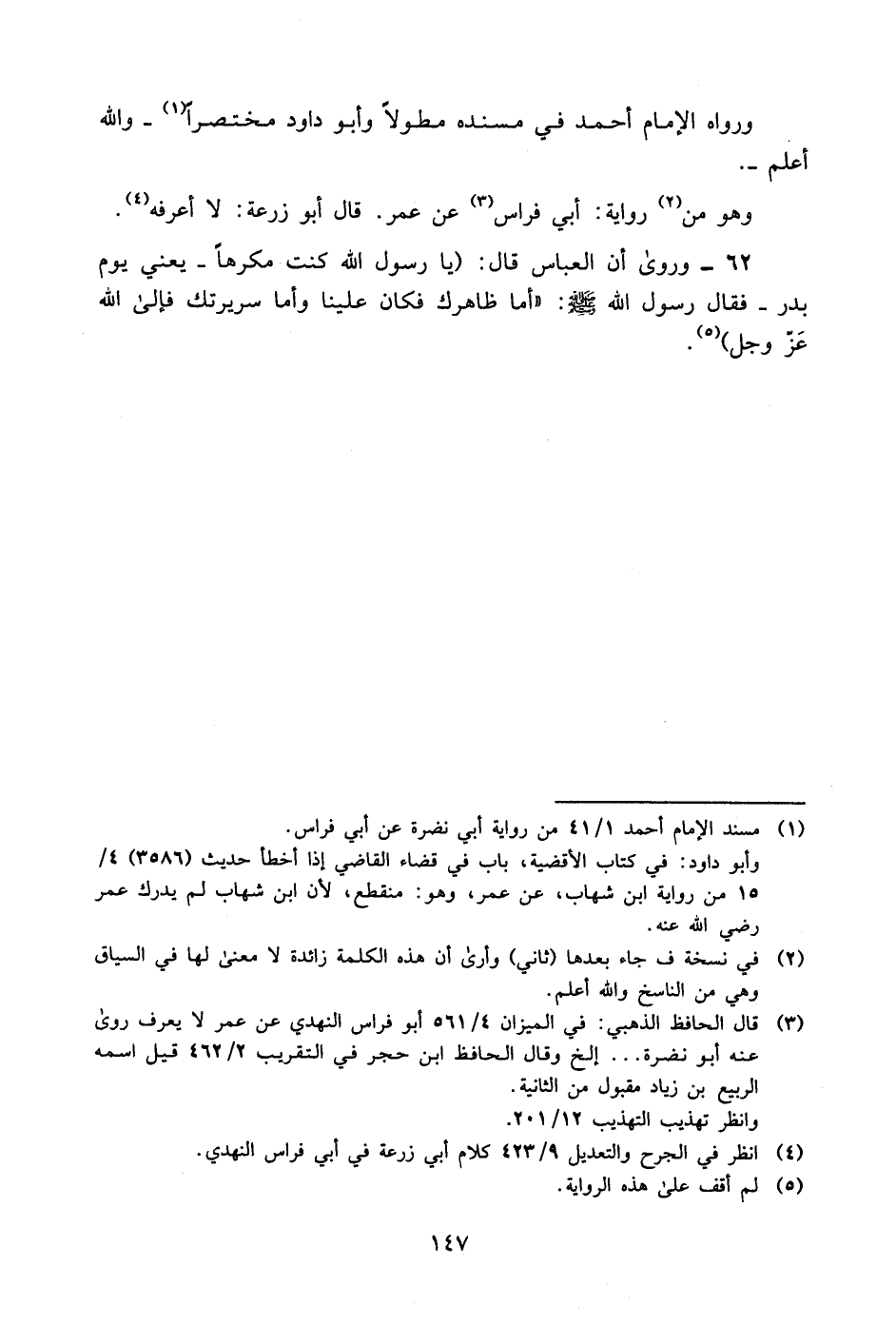 3 قال الحافظ الذهبي في الميزان 4/ 561: أبو فراس النهدي عن عمر لا يعرف روى عنه أبو نضرة ... إلخ. وقال الحافظ ابن حجر في التقريب 2/ 462: قيل: اسمه الربيع بن زياد, مقبول من الثانية.