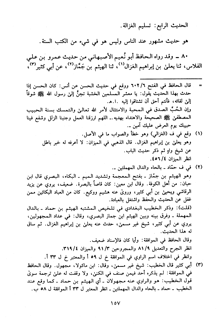 3 "أبي كثير" قال الخطيب: شيخ غير مسمى، وقال ابن ماكولا: مجهول, وقال الحافظ في الموافقة: لم يذكره أحد فيمن صنف في الكنى، ولا وقفت له على ترجمة سوى قول الخطيب: هو والراوي عنه مجهولان -أي الهيثم بن حماد- كما وقع عند الخطيب حماد, بالحاء والدال المهملتين. انظر المعتبر ل33 أالموافقة ل58 ب.