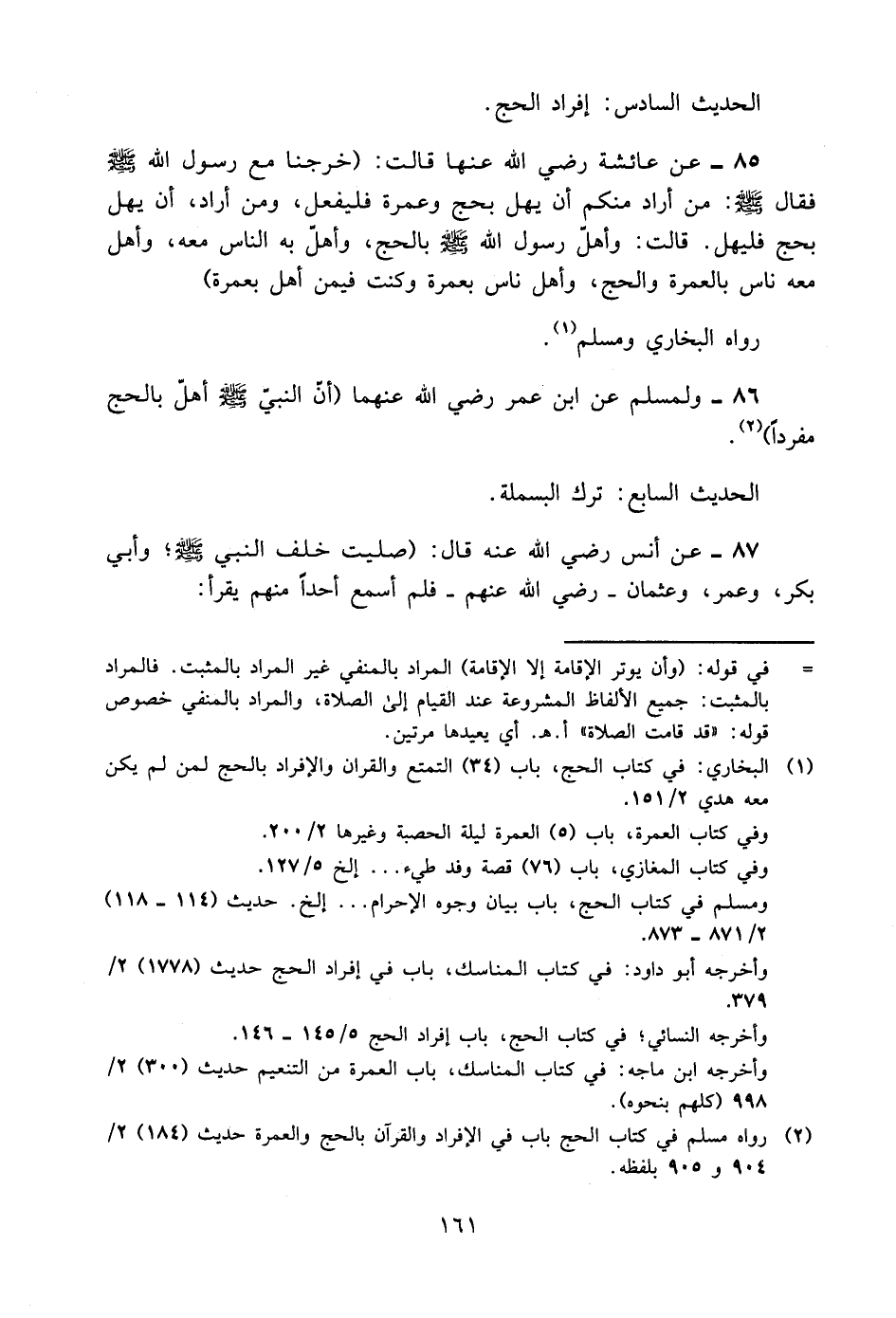 86- ولمسلم عن ابن عمر, رضي الله عنهما "أن النبي -صلى الله عليه وسلم- أهل بالحج مفردا"2.