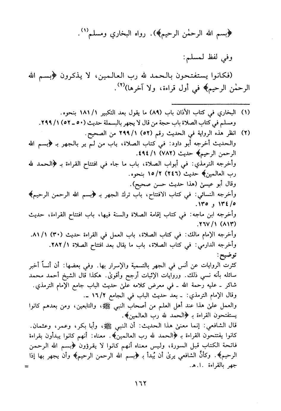 قال الشافعي: إنما معنى هذا الحديث: أن النبي -صلى الله عليه وسلم- وأبا بكر وعمر وعثمان كانوا يفتتحون القراءة بـ {الْحَمْدُ لِلَّهِ رَبِّ الْعَالَمِينَ} . معناه: أنهم كانوا يبدءون بقراءة فاتحة الكتاب قبل السورة, وليس معناه أنهم كانوا لا يقرءون {بِسْمِ اللَّهِ الرَّحْمَنِ الرَّحِيمِ} . وكان الشافعي يرى أن يُبدأ بـ {بِسْمِ اللَّهِ الرَّحْمَنِ الرَّحِيمِ} وأن يجهر بها إذا جهر بالقراءة. ا. هـ. =