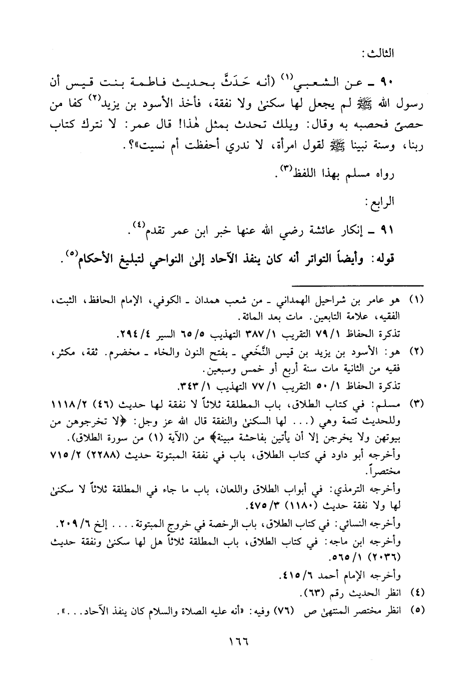 90- عن الشعبي1 "أنه حدّث بحديث فاطمة بنت قيس, أن رسول الله -صلى الله عليه وسلم- لم يجعل لها سكنى ولا نفقة، فأخذ الأسود بن يزيد2 كفا من حصا فحصبه به وقال: ويلك تحدث بمثل هذا! قال عمر: لا نترك كتاب ربنا، وسنة نبينا -صلى الله عليه وسلم- لقول امرأة، لا ندري أحفظت أم نسيت".