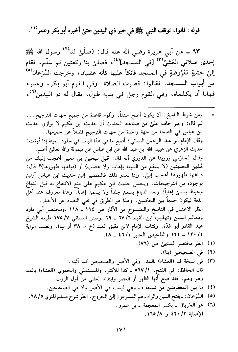93- عن أبي هريرة -رضي الله عنه- قال: "صلى لنا2 رسول الله -صلى الله عليه وسلم- إحدى صلاتي العشي3 [في المسجد] 4، فصلى بنا ركعتين ثم سلم، فقام إلى خشبة معروضة في المسجد فاتكأ عليها كأنه غضبان، وخرجت السَّرَعان5 من أبواب المسجد. فقالوا: قصرت الصلاة, وفي القوم أبو بكر وعمر، فهابا أن يكلماه، وفي القوم رجل في يديه طول، يقال له: ذو اليدين6،