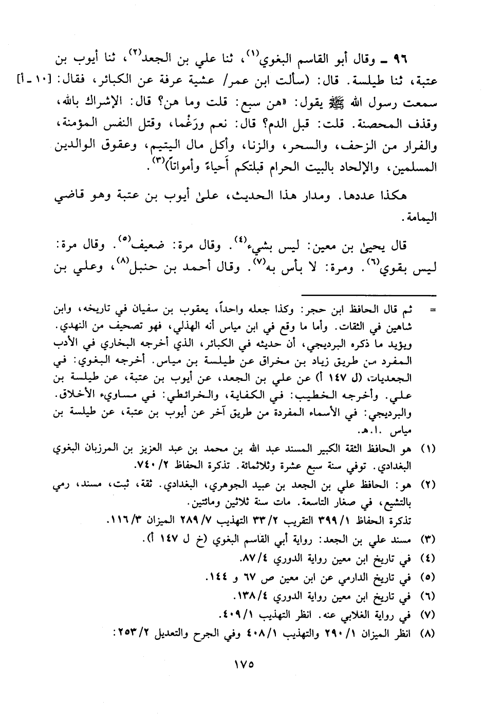 96- وقال أبو القاسم البغوي1: ثنا علي بن الجعد2، ثنا أيوب بن عتبة، ثنا طيلسة, قال: "سألت ابن عمر عشية عرفة عن الكبائر، فقال: سمعت رسول الله -صلى الله عليه وسلم- يقول: "هن سبع" قلت: وما هن؟ قال: "الإشراك بالله، وقذف المحصنة". قلت: قبل الدم؟ قال: "نعم ورغما، وقتل النفس المؤمنة، والفرار من الزحف، والسحر، والزنا، وأكل مال اليتيم، وعقوق الوالدين المسلمين، والإلحاد بالبيت الحرام قبلتكم, أحياء وأمواتا""3.