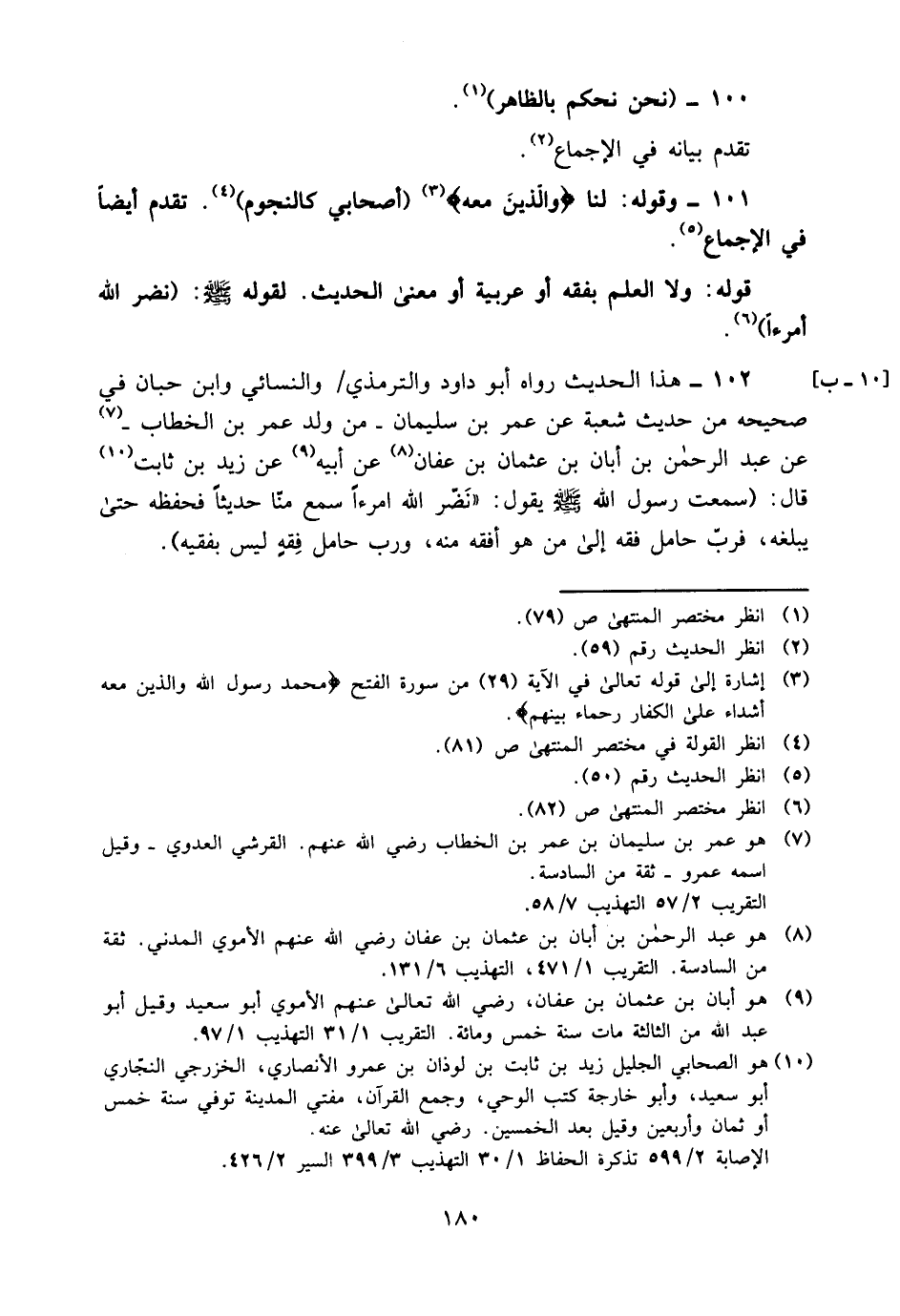 102- هذا الحديث رواه أبو داود والترمذي والنسائي وابن حبان في صحيحه من حديث شعبة عن عمر بن سليمان -من ولد عمر بن الخطاب7- عن عبد الرحمن بن أبان بن عثمان بن عفان8 عن أبيه9 عن زيد بن ثابت10 قال: "سمعت رسول الله -صلى الله عليه وسلم- يقول: "نضر الله امرأ سمع منا حديثا فحفظه حتى يبلغه، فرب حامل فقه إلى من هو أفقه منه، ورب حامل فقه ليس بفقيه" ".