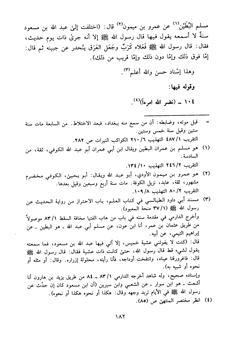 مسلم البطين1 عن عمرو بن ميمون2 قال: "اختلفت إلى عبد الله بن مسعود سنة لا أسمعه يقول فيها: قال رسول الله -صلى الله عليه وسلم- إلا أنه جرى ذات يوم حديث، فقال: قال رسول الله -صلى الله عليه وسلم- فعلاه كرب وجعل العرق ينحدر عن جبينه ثم قال: إما فوق ذلك, وإما دون ذلك, وإما قريب من ذلك".