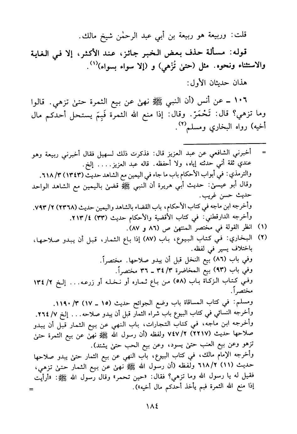 106- عن أنس "أن النبي -صلى الله عليه وسلم- نهى عن بيع الثمرة حتى تزهي, قالوا: وما تزهي؟ قال: "تحمرّ" وقال: "إذا منع الله الثمرة فبم يستحل أحدكم مال أخيه؟ " " رواه البخاري ومسلم2.