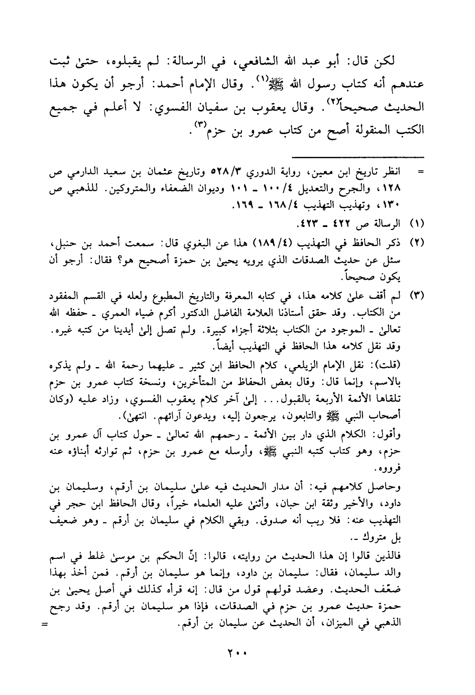 لكن قال أبو عبد الله الشافعي، في الرسالة: لم يقبلوه، حتى ثبت عندهم أنه كتاب رسول الله, صلى الله عليه وسلم1. وقال الإمام أحمد: أرجو أن يكون هذا الحديث صحيحا2. وقال يعقوب بن سفيان القسوي: لا أعلم في جميع الكتب المنقولة أصح من كتاب عمرو بن حزم3.