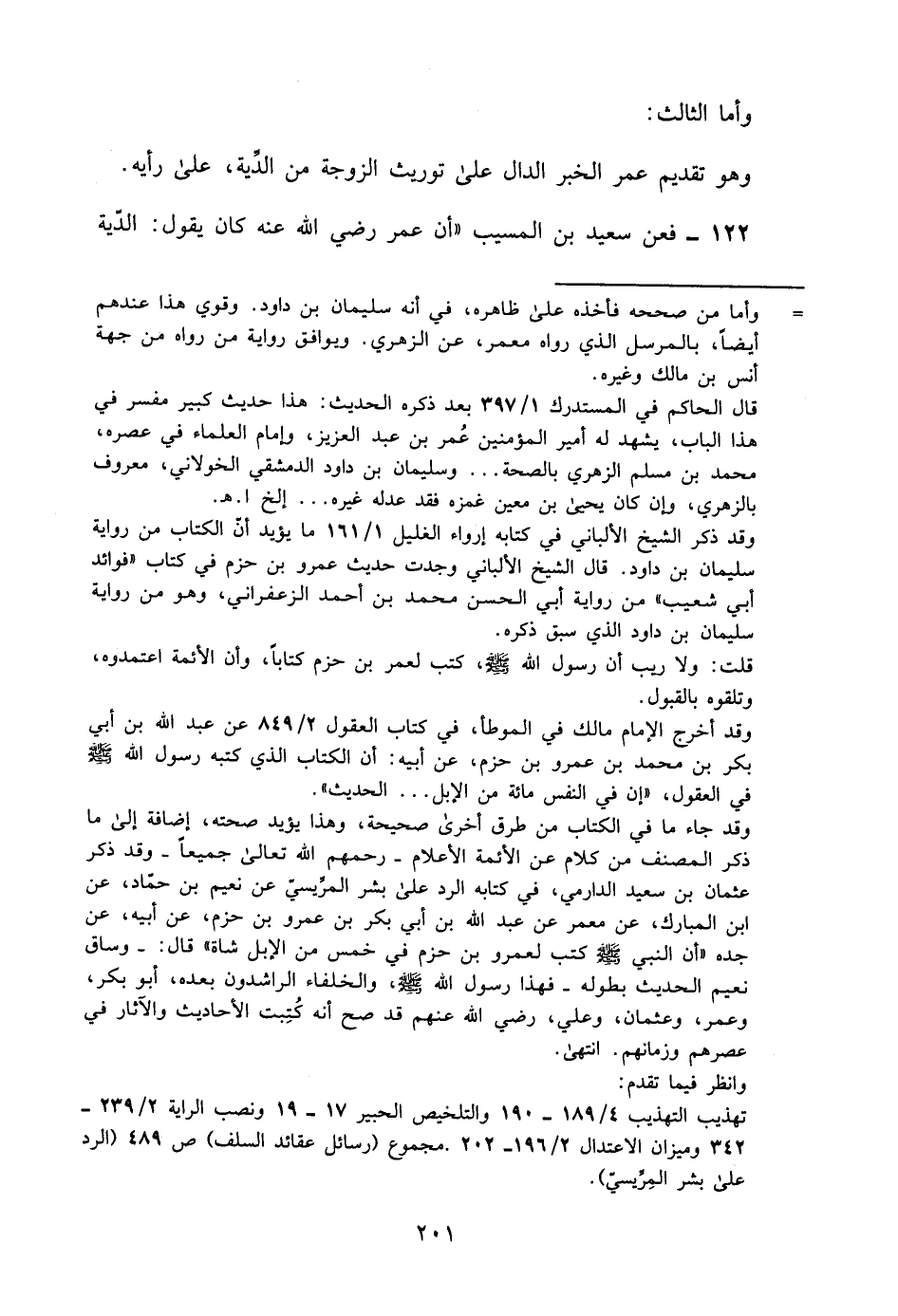 قلت: ولا ريب أن رسول الله -صلى الله عليه وسلم- كتب لعمرو بن حزم كتابا، وأن الأئمة اعتمدوه، وتلقوه بالقبول.
