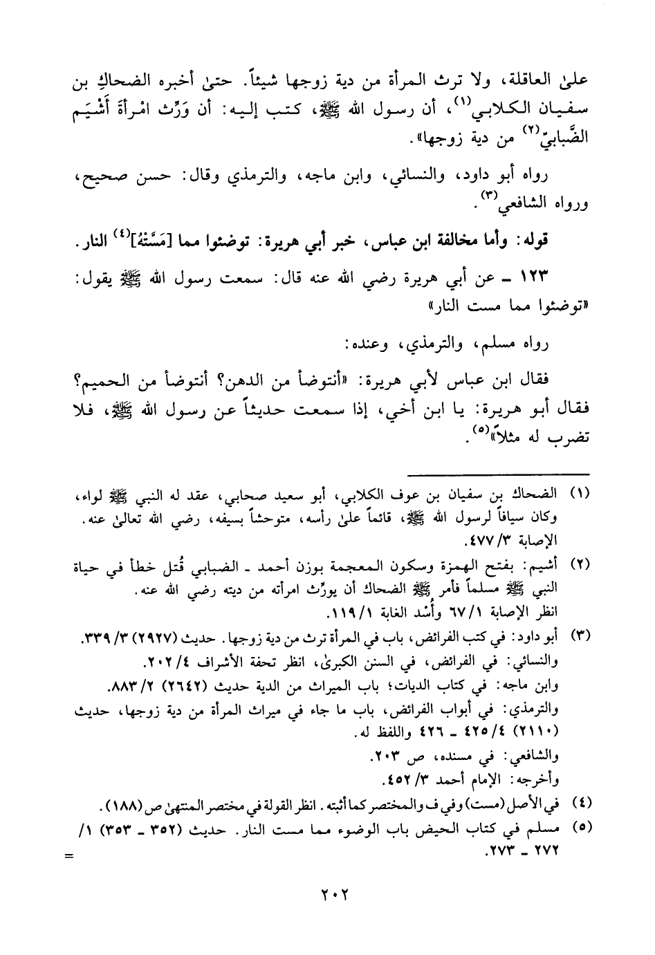 123- عن أبي هريرة -رضي الله عنه- قال: سمعت رسول الله -صلى الله عليه وسلم- يقول: "توضئوا مما مست النار".