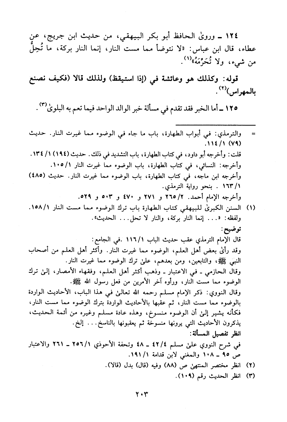 124- وروى الحافظ أبو بكر البيهقي، من حديث ابن جريج، عن عطاء، قال ابن عباس: "لا تتوضأ مما مست النار، إنما النار بركة، ما تحل من شيء ولا تحرمه"1.