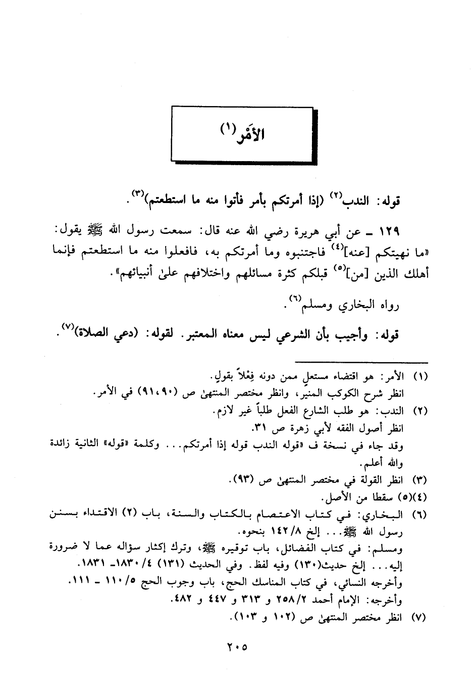 129- عن أبي هريرة -رضي الله عنه- قال: سمعت رسول الله -صلى الله عليه وسلم- يقول: "ما نهيتكم [عنه] 4 فاجتنبوه, وما أمرتكم به فافعلوا منه ما استطعتم؛ فإنما أهلك الذين [من] 5 قبلكم كثرة مسائلهم واختلافهم على أنبيائهم".