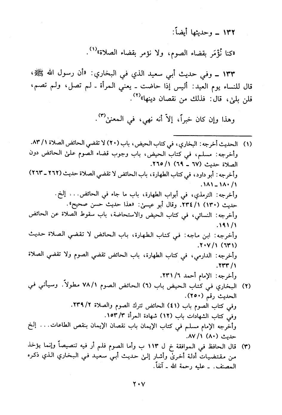133- وفي حديث أبي سعيد الذي في البخاري: "أن رسول الله -صلى الله عليه وسلم- قال للنساء يوم العيد: "أليس إذا حاضت -يعني المرأة- لم تصل، ولم تصم؟ " قلن: بلى، قال: "فذلك من نقصان دينها" "2.