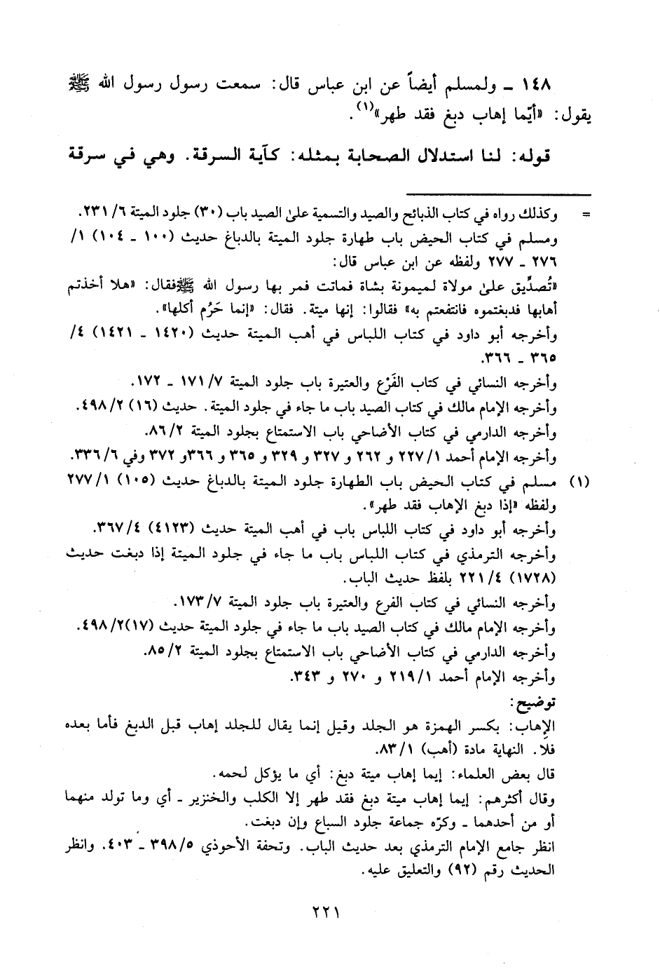 148- ولمسلم أيضا عن ابن عباس قال: سمعت رسول الله -صلى الله عليه وسلم- يقول: "أيما إهاب دبغ فقد طهر" 1.