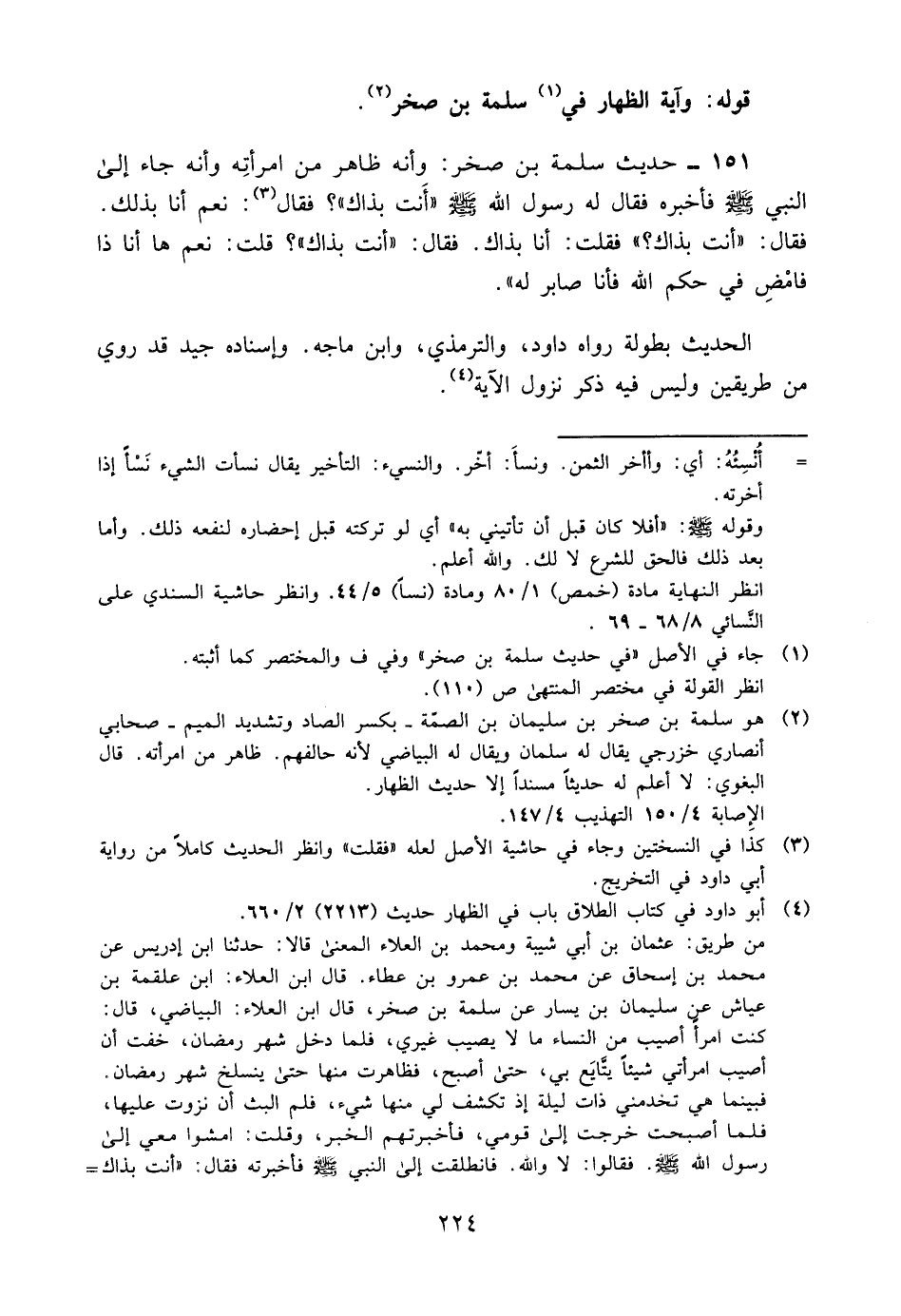 151- حديث سلمة بن صخر: وأنه ظاهر من امرأته, وأنه جاء إلى النبي -صلى الله عليه وسلم- فأخبره, فقال له رسول الله صلى الله عليه وسلم: "أنت بذاك؟ " فقال3: نعم أنا بذلك. فقال: "أنت بذاك؟ " فقلت: أنا بذاك. فقال: "أنت بذاك؟ " قلت: نعم ها أنا ذا, فامض في حكم الله فأنا صابر له.