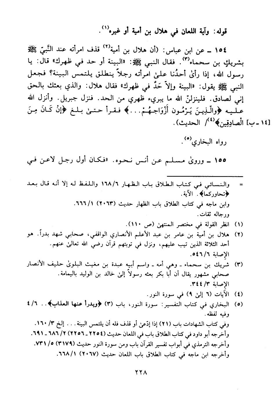 154- عن ابن عباس: "أن هلال بن أمية2 قذف امرأته عند النبي -صلى الله عليه وسلم- بشريك بن سحماء3, فقال النبي صلى الله عليه وسلم: "البينة أو حد في ظهرك" قال: يا رسول الله، إذا رأى أحدنا على امرأته رجلا ينطلق يلتمس البينة؟! فجعل النبي -صلى الله عليه وسلم- يقول: "البينة وإلا حد في ظهرك" فقال هلال: والذي بعثك بالحق إني لصادق, فلينزلن الله ما يبرئ ظهري من الحد. فنزل جبريل, وأنزل الله عليه: {وَالَّذِينَ يَرْمُونَ أَزْوَاجَهُمْ ... } فقرأ حتى بلغ {إِنْ كَانَ مِنَ الصَّادِقِين} 4 ... الحديث".