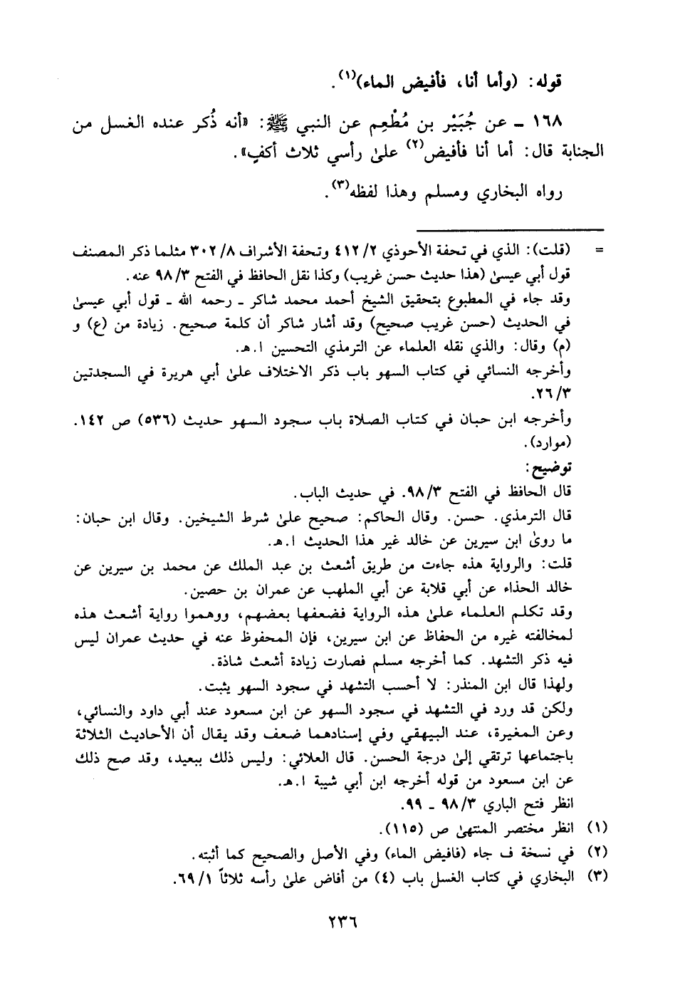 168- عن جبير بن مطعم, عن النبي صلى الله عليه وسلم: "أنه ذُكر عنده الغسل من الجنابة قال: "أما أنا فأفيض2 على رأسي ثلاث أكف" ".