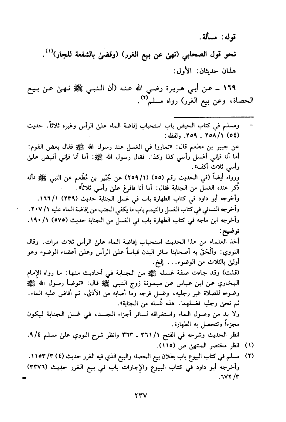 169- عن أبي هريرة رضي الله عنه "أن النبي -صلى الله عليه وسلم- نهى عن بيع الحصاة، وعن بيع الغرر" رواه مسلم2.