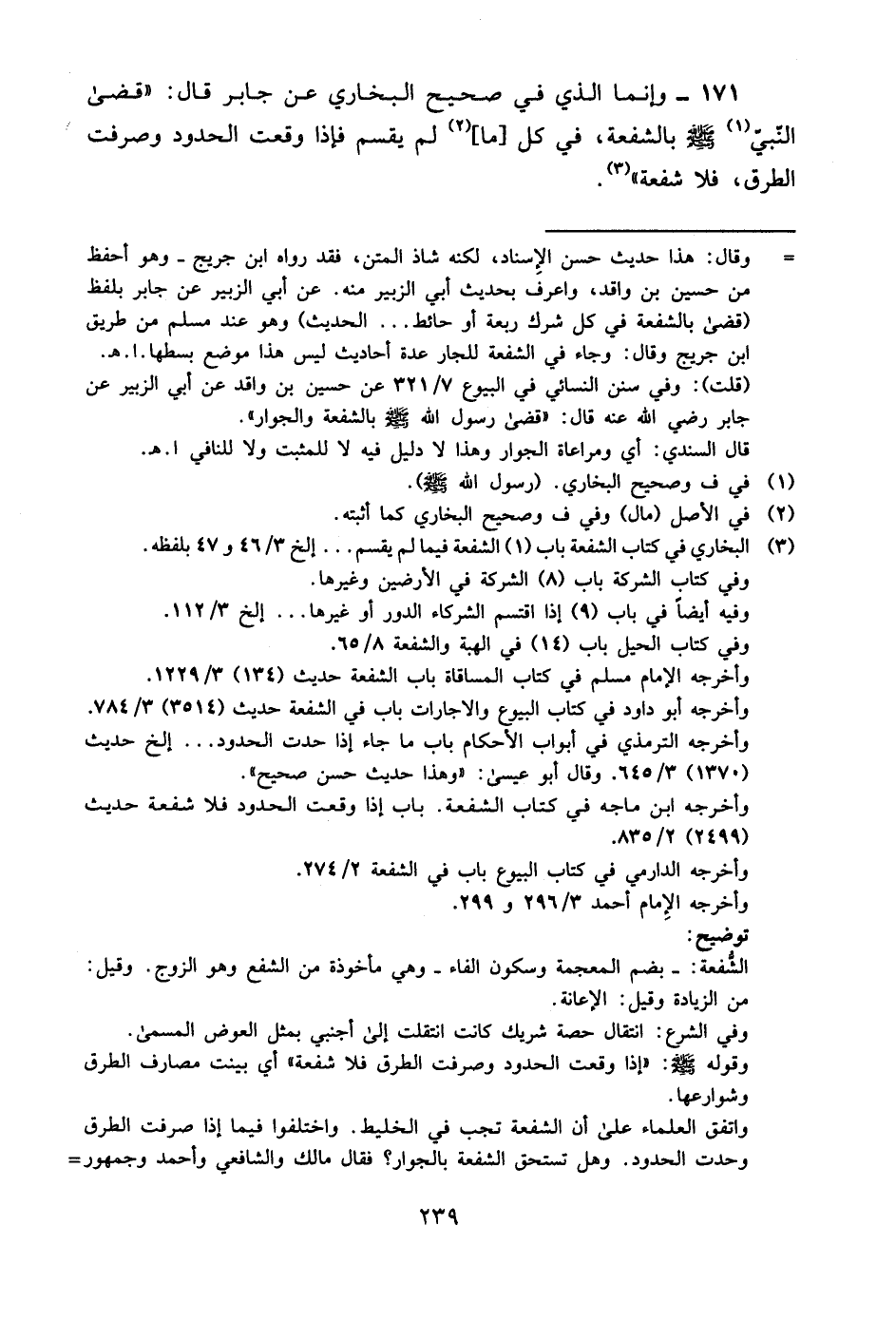 171- وإنما الذي في صحيح البخاري عن جابر قال: "قضى النبي1 -صلى الله عليه وسلم- بالشفعة في كل [ما] 2 لم يقسم, فإذا وقعت الحدود وصرفت الطرق فلا شفعة"3.