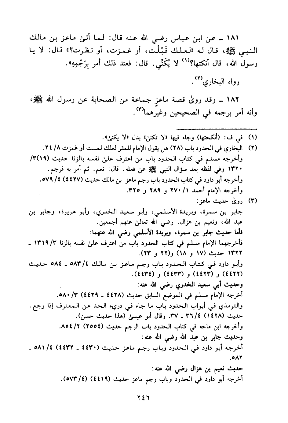 181- عن ابن عباس -رضي الله عنهما- قال: لما أتى ماعز بن مالك النبي -صلى الله عليه وسلم- قال له: "لعلك قبّلت، أو غمزت، أو نظرت؟ " قال: لا يا رسول الله، قال: "أنكتها؟ " 1 لا يكني. قال: فعند ذلك أمر برجمه.