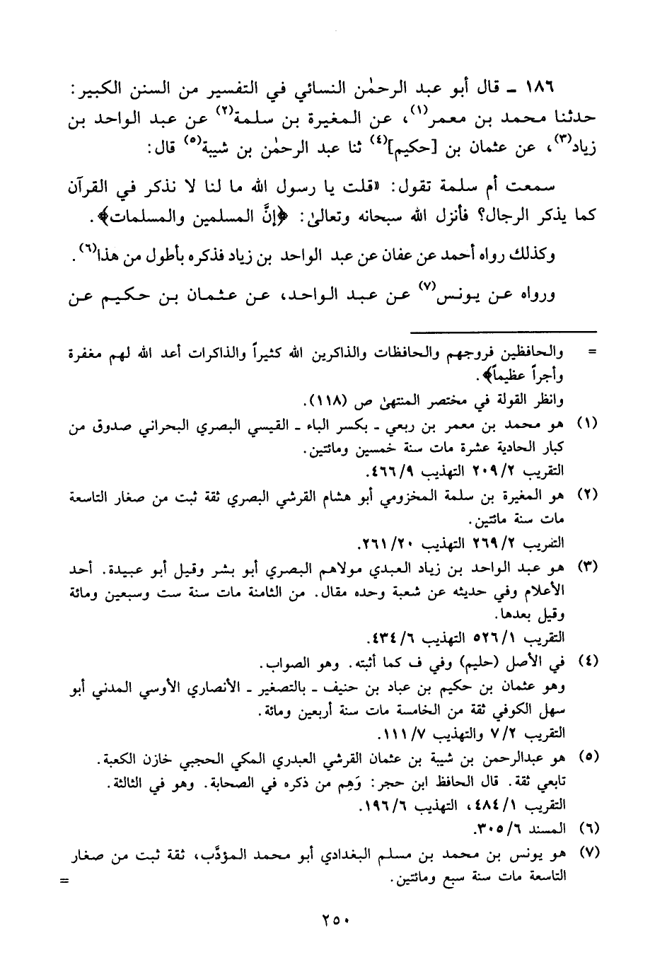 186- قال أبو عبد الرحمن النسائي في التفسير من السنن الكبير: حدثنا محمد بن معمر1, عن المغيرة بن سلمة2, عن عبد الواحد بن زياد3، عن عثمان بن [حكيم] 4, ثنا عبد الرحمن بن شيبة5 قال:
